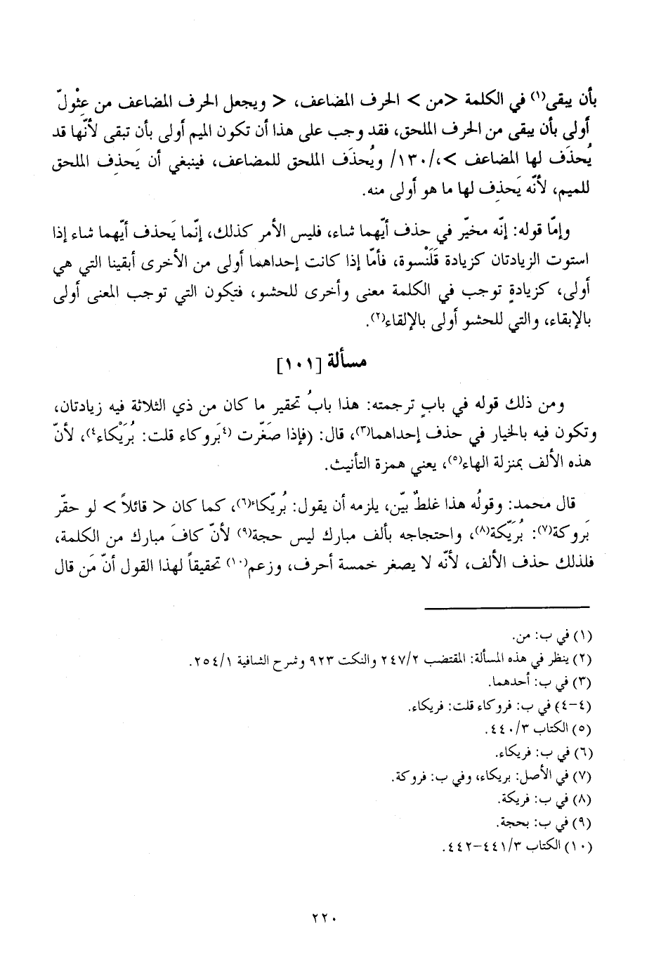 ومن ذلك قوله في باب ترجمته: هذا باب تحقير ما كان من ذي الثلاثة فيه زيادتان، وتكون فيه بالخيار في حذف إحداهما، قال: (فإذا صغرت برو كاء قلت: بريكاء)، لأن هذه الألف بمنزلة الهاء، يعني همزة التأنيث.