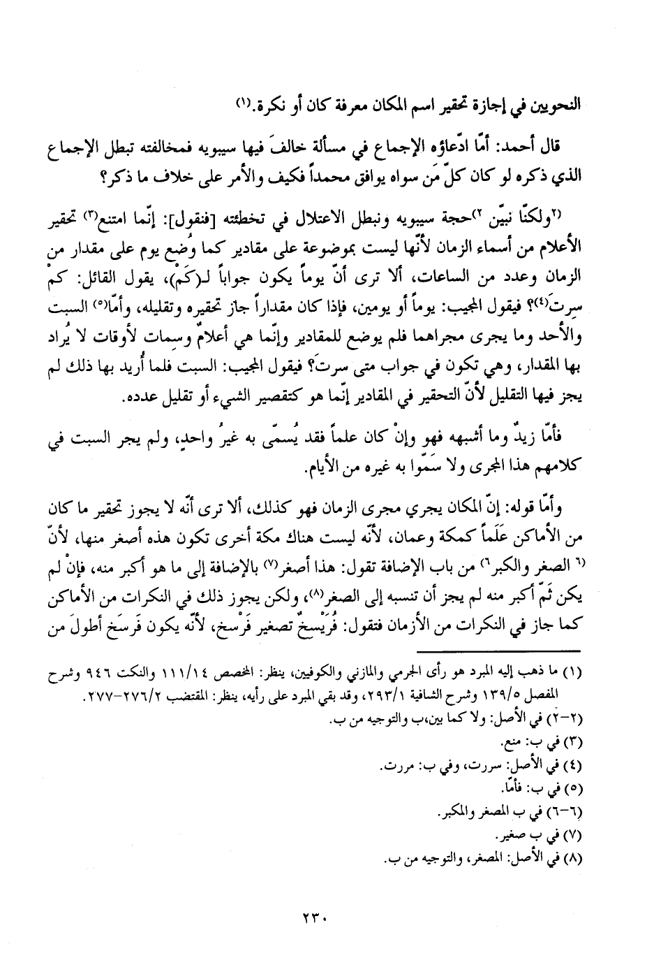 قال أحمد: أما ادعاؤه الإجماع في مسألة خالف فيها سيبويه فمخالفته تبطل الإجماع الذي ذكره لو كان كل من سواه يوافق محمدا فكيف والأمر على خلاف ما ذكر؟