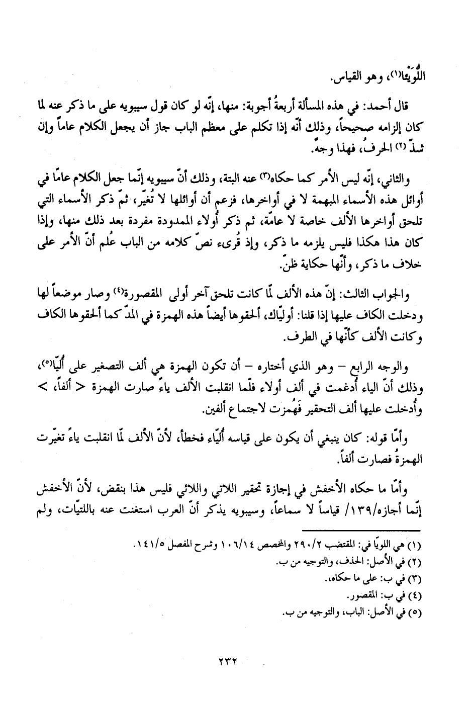 قال أحمد: في هذه المسألة أربعة أجوبة: إنه لو كان قول سيبويه على ما ذكر عنه لما كان إلزامه صحيحا، وذلك أنه إذا تكلم على معظم الباب جاز أن يجعل الكلام عاما وإن شذ الحرف، فهذا وجه.