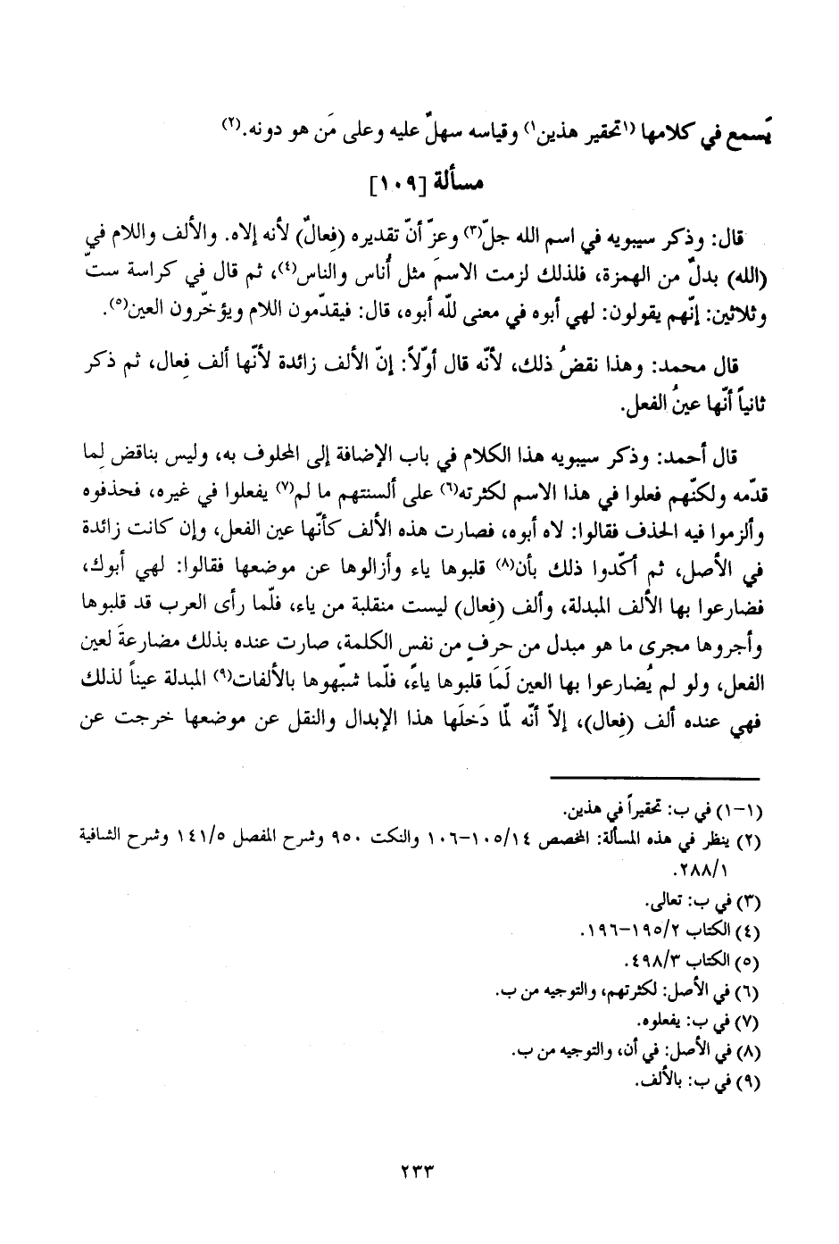 قال: وذكر سيبويه في اسم الله جل وعز أن تقديره (فعال) لأنه إلاه. والألف واللام في (الله) بدل من الهمزة، فلذلك لزمت الاسم مثل أناس والناس، ثم قال في كراسة ست وثلاثين: إنهم يقولون: لهي أبوه في معنى لله أبوه، قال: فيقدمون اللام ويؤخرون العين.