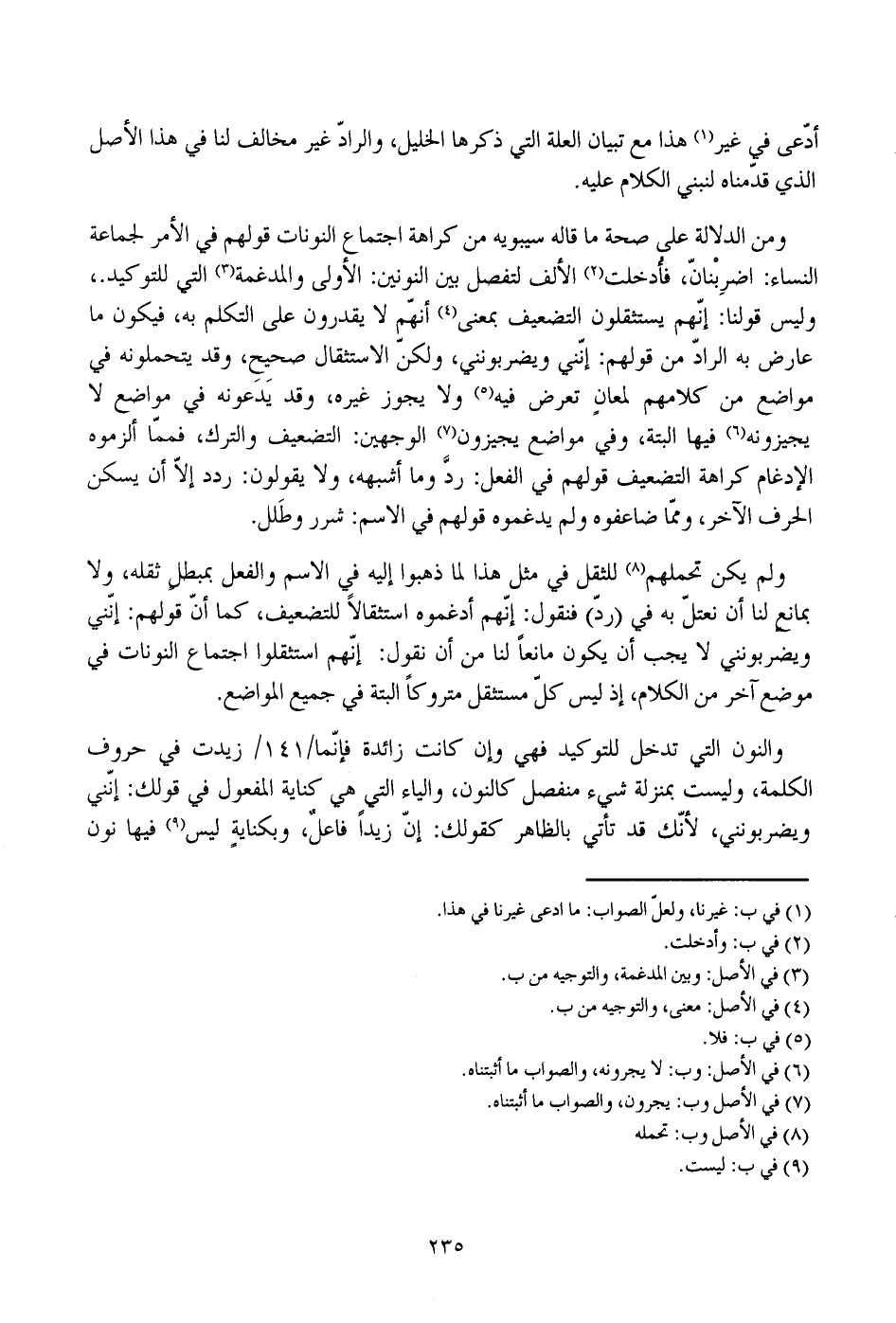 ومن الدلالة على صحة ما قاله سيبويه من كراهة اجتماع النونات قولهم في الأمر لجماعة النساء: اضربنان، فأدخلت الألف لتفصل بين النونين: الأولى والمدغمة التي للتوكيد، وليس قولنا: إنهم يستثقلون التضعيف بمعنى أنهم لا يقدرون على التكلم به، فيكون ما عارض به الراد من قولهم: إنني ويضربونني، ولكن الاستثقال صحيح، وقد يتحملونه في مواضع من كلامهم لمعان تعرض فيه ولا يجوز غيره، وقد يدعونه في مواضع لا يجيزونه فيها البتة، وفي مواضع يجيزون الوجهين: التعضيف والترك، فمما ألزموه الإدغام كراهة التضعيف قولهم في الفعل: رد وما أشبهه، ولا يقولون: ردد إلا أن يسكن الحرف الآخر، ومما ضاعفوه ولم يدغموه قولهم في الاسم: شرر وطلل.