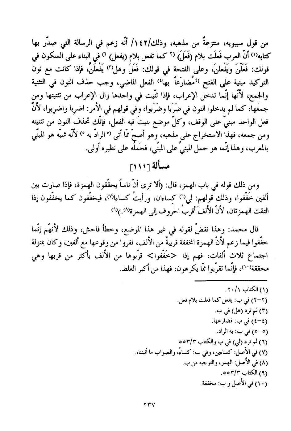 قال محمد: وهذا نقض لقوله في غير هذا الموضع، وخطأ فاحش، وذلك لأنهم إنما خففوا فيما زعم لأن الهمزة المخففة قريبة من الألف، ففروا من وقوعها مع ألفين، وكان بمنزلة اجتماع ثلاث ألفات، فهم إذا "خففوا" قربوها من الألف بأكثر من قربها وهي محققة، فإنما تقربوا مما يكرهون، فهذا من أكبر الغلط.
