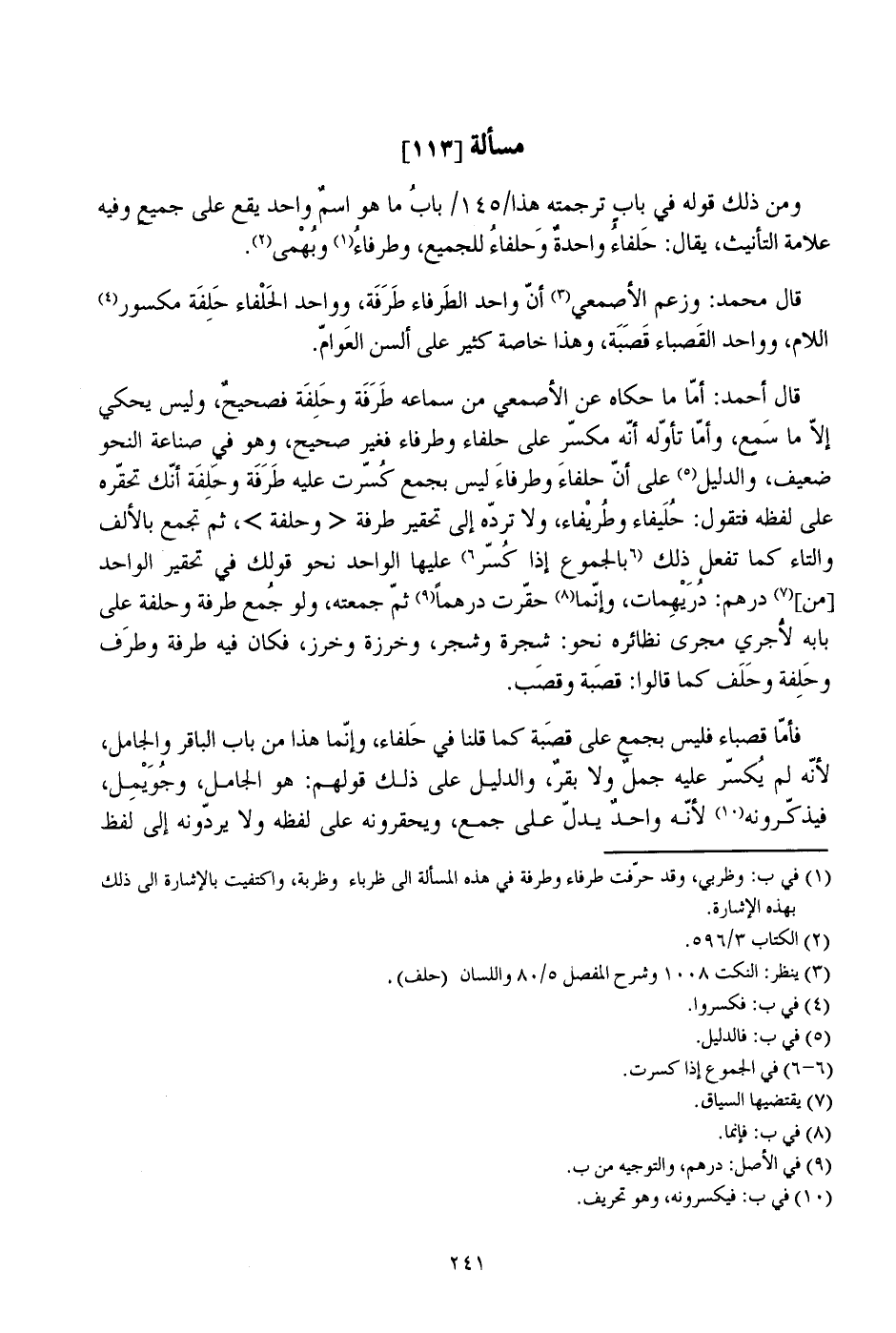 قال أحمد: أما ما حكاه عن الأصمعي من سماعه طرفة وحلفة فصحيح، وليس يحكي إلا ما سمع، وأما تأوله أ، هـ مكسر على حلفاء وطرفاء فغير صحيح، وهو في صناعة النحو ضعيف، والدليل على أن حلفاء وطرفاء ليس بجمع كسرت عليه طرفة وحلفة أنك تحقره على لفظه فتقول: حليفاء وطريفاء، ولا ترده إلى تحقير طرفة "وحلفة"، ثم تجمع بالألف والتاء كما تفعل ذلك بالجموع إذا كسر عليها الواحد نحو قولك في تحقير الواحد [من] درهم: دريهمات، وإنما حقرت درهما ثم جمعته، ولو جمع طرفة وحلفة على بابه لأجرى مجرى نظائره نحو: شجرة وشجر، وخرزة وخرز، فكان فيه طرفة وطرف وحلفة وحلف كما قالوا: قصبة وقصب.