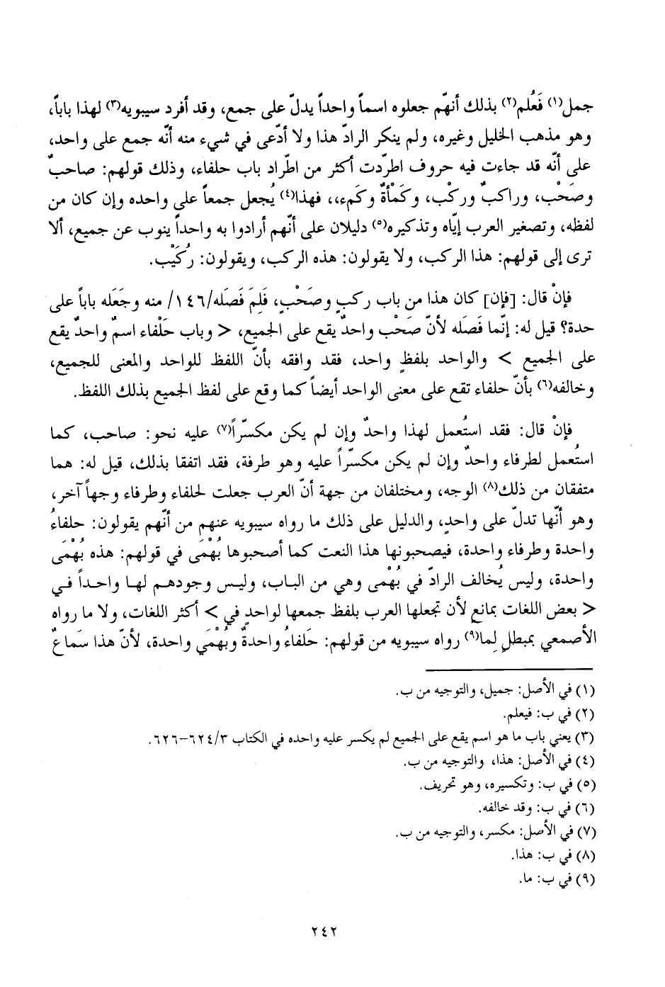 فإن قال: [فإن] كان هذا من باب ركب وصحب، فلم فصله/ 146/ منه وجعله باب على حدة؟ قيل له: إنما فصله لأن صحب واحدي قع على الجميع، "وباب حلفاء اسم واحد يقع على الجميع" والواحد بلفظ واحد، فقد وافقه بأن اللفظ للواحد والمعنى للجميع، وخالفه بأن حلفاء تقع على معنى الواحد أيضا كما وقع على لفظ الجميع بذلك اللفظ.