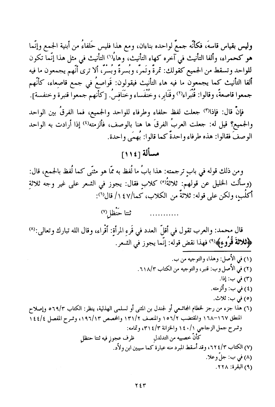 ومن ذلك قوله في باب ترجمته: هذا باب ما لفظ به مما هو مثنى كما لفظ بالجمع، قال: (وسألت الخليل عن قولهم: ثلاثة كلاب فقال: يجوز في الشعر على غير وجه ثلاثة أكلب، ولكن على قوله: ثلاثة من الكلاب، كما/ 147/ قال: