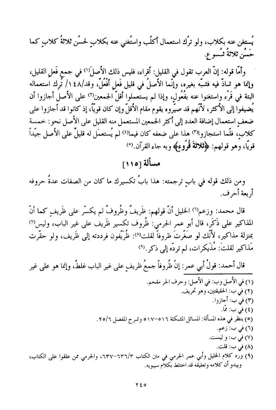 ومن ذلك قوله في باب ترجمته: هذا باب تكسيرك ما كان من الصفات عدة حروفه أربعة أحرف.