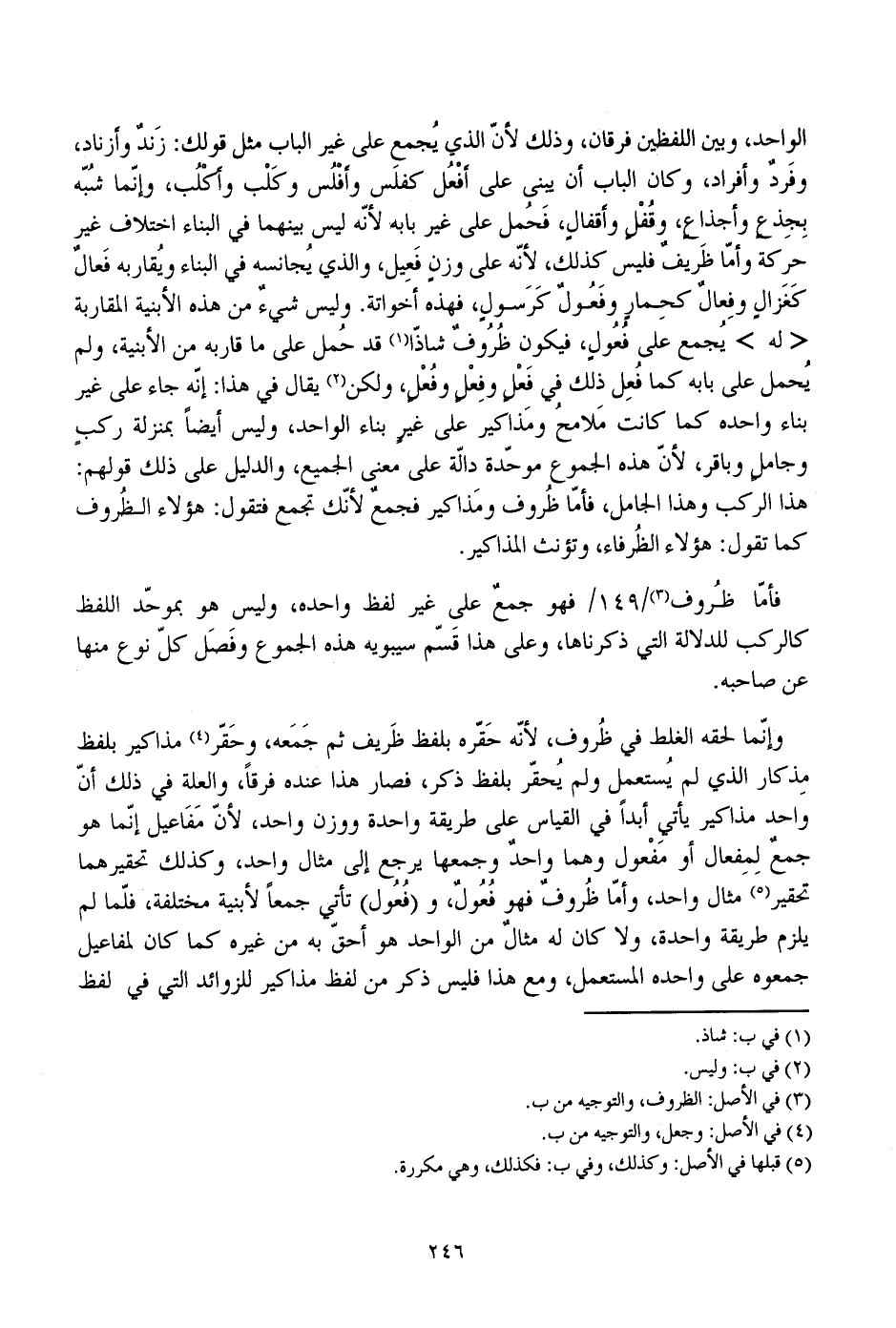 فأما ظروف/ 149/ فهو جمع على غير لفظ واحده، وليس هو بموحد اللفظ كالركب للدلالة التي ذكرناها، وعلى هذا قسم سيبويه هذه الجموع وفصل كل نوع منها عن صاحبه.