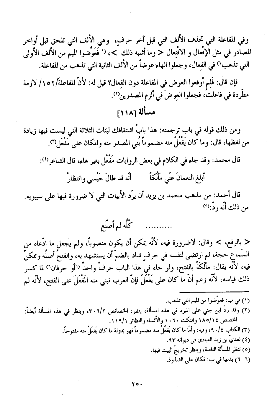 وفي المفاعلة التي تحذف الألف التي قبل آخر حرف، وهي الألف التي تلحق قبل أواخر المصادر في مثل الإفعال والافتعال "وما أشبه ذلك"، فعوضوا الميم من الألف الأولى التي تذهب في الفعال، وجعلوا الهاء عوضا من الألف الثانية التي تذهب من المفاعلة.