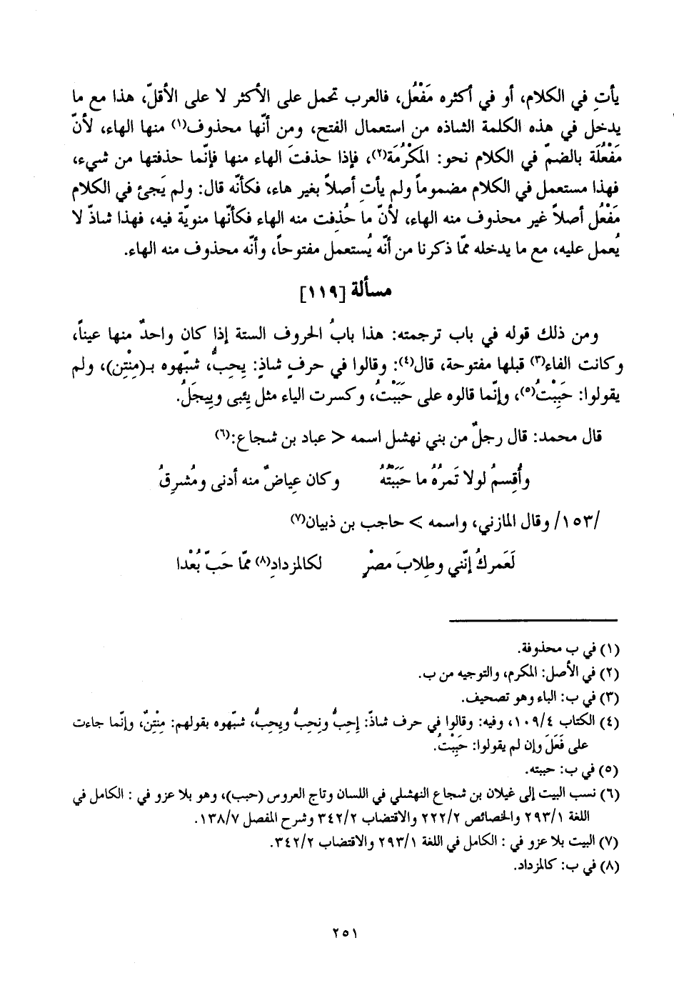 ومن ذلك قوله في باب ترجمته: هذا باب الحروف الستة إذا كان واحدا منها عينا، وكانت الفاء قبلها مفتوحة، قال: وقالوا في حرف شاذ: يحب، شبهوه بـ) منتن (، ولم يقولوا: حببت، وإنما قالوه على حببت، وكسرت الياء مثل يئبى ويبجل.