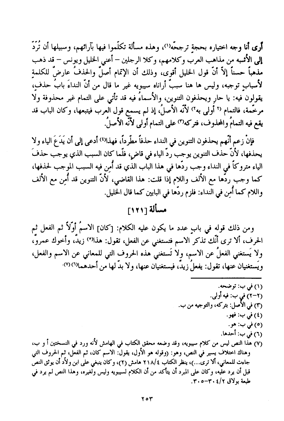 أرى أنا وجه اختياره بحجة ترجحه، وهذه مسألة تكلموا فيها بآرائهم، وسبيلها أن ترد إلى الأشبه من مذاهب العرب وكلامهم، وكلا الرجلين- أعني الخليل ويونس- قد ذهب مذهبا حسنا إلا أن قول الخليل أقوى، وذلك أن الإتمام أصل والحذف عارض للكلمة لأسباب توجبه، وليس ها هنا سبب أراناه سيبويه غير ما قال من أن النداء باب حذف، يقولون فيه: يا حار ويحذفون التنوين، والأسماء فيه قد تأتي على التمام غير محذوفة ولا مرخمة، فالتمام أولى به لأنه الأصل، إذ لم يسمع قول العرب فيتبعها، وكان الباب قد يقع فيع التمام والمحذوف، فتركه على التمام أولى لأنه الأصل.