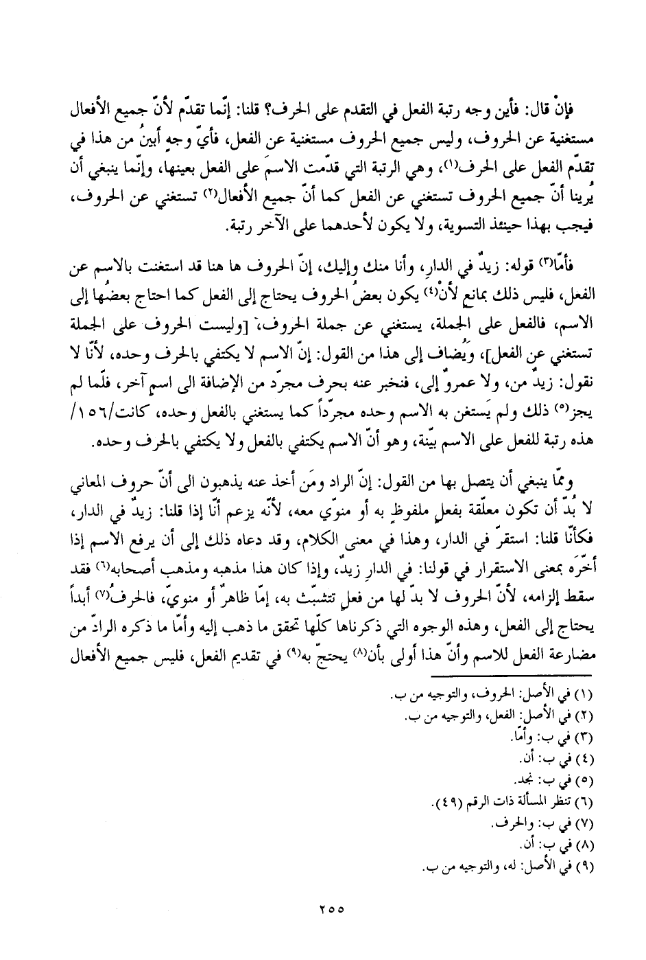 فإن قال: فأين وجه رتبة الفعل في التقدم على الحرف؟ قلنا: إنما تقدم لأن جميع الأفعال مستغنية عن الحروف، وليس جميع الحروف مستغنية عن الفعل، فأي وجه أبني من هذا في تقدم الفعل على الحرف، وهي الرتبة التي قدمت الاسم على الفعل بعينها، وإنما ينبغي أن يرينا أن جميع الحروف تستغني عن الفعل كما أن جميع الأفعال تستغني عن الحروف، فيجب بهذا حينئذ التسوية، ولا يكون لأحدهما على الآخر رتبة.