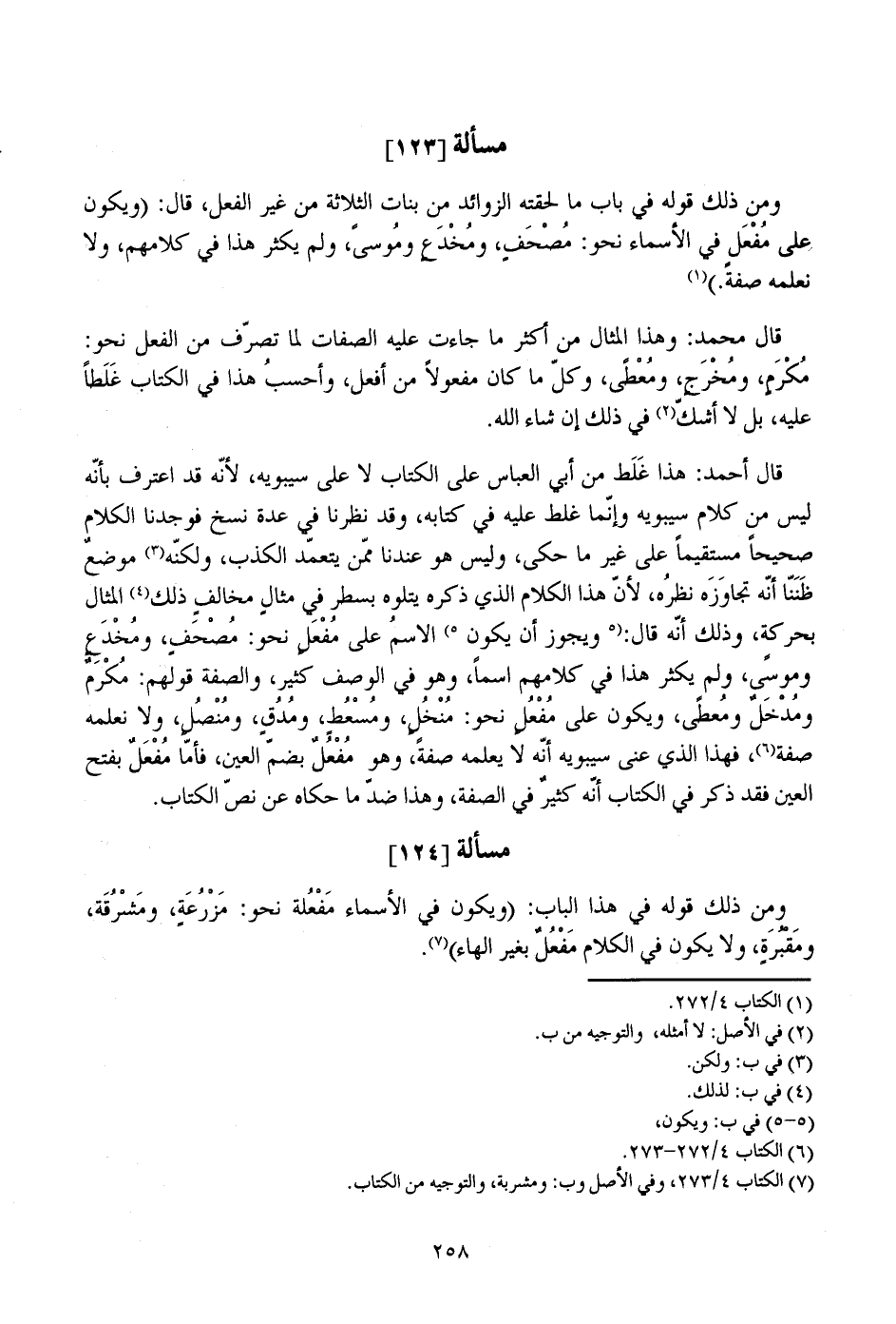 قال محمد: وهذا المثال من أكثر ما جاءت عليه الصفات لما تصرف من الفعل نحو: مكرم، ومخرج، ومعطى، وكل ما كان مفعولا من أفعل، وأحسب هذا في الكتاب غلطا عليه، بل لا أشك في ذلك إن شاء الله.