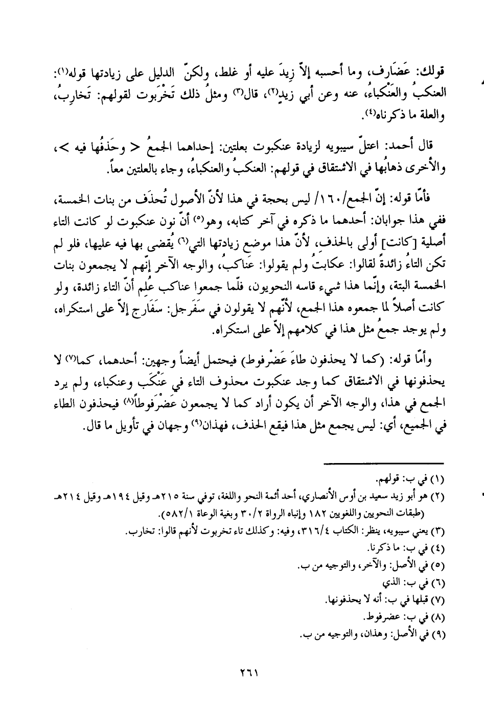 قال أحمد: اعتل سيبويه لزيادة عنكبوت بعلتين: إحداهما الجمع "وحذفها فيه"، والأخرى ذهابها في الاشتقاق في قولهم: العنكب والعنكباء، وجاء بالعلتين معا.