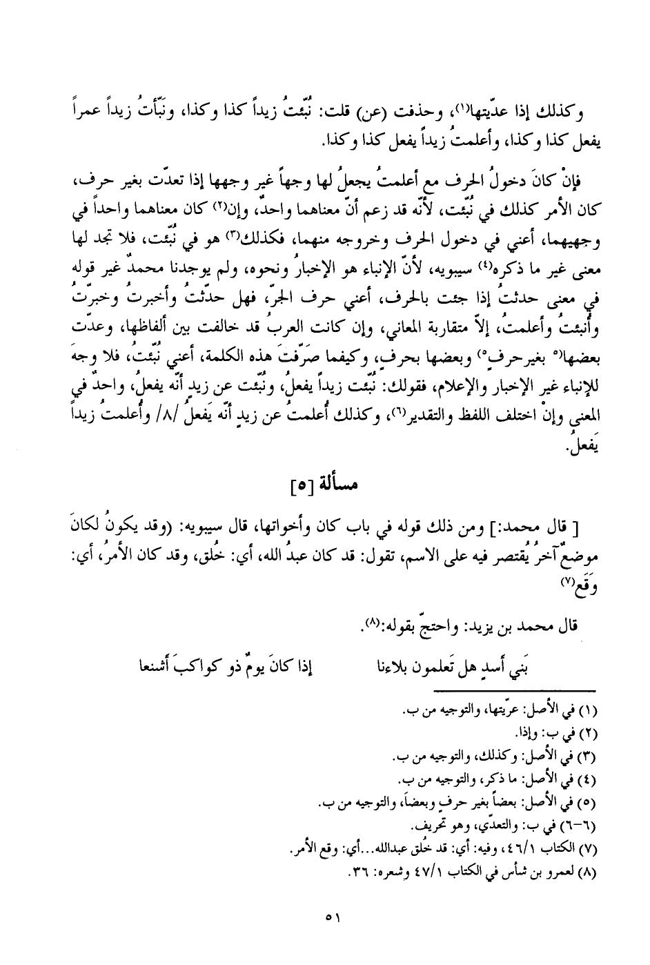 فإن كان دخول الحرف مع أعلمت يجعل لها وجها غير وجهها إذا تعددت بغير حف، كان الأمر كذلك في نبئت، لأنه قد زعم أن معناها واحد، وإن كان معناهما واحدا في وجهيهما، أعني في دخول الحرف وخروجه منهما، فكذلك هو في نبئت، فلا تجد لها معنى غير ما ذكره سيبويه، لأن الإنباء هو الإخبار ونحوه، ولم يوجدنا محمد غير قوله في معنى حدثت إذا جئت بالحرف، أعني حرف الجر، فهل حدثت وأخبرت وخبرت وأنبئت وأعلمت، إلا متقاربة المعاني، وإن كانت العرب قد خالفت بين ألفاظها، وعدت بعضها بغير حرف وبعضها بحرف، وكيفما صرفت هذه الكلمة، أعني نبئت، فلا وجه للإنباء غير الإخبار والإعلام، فقولك: نبئت زيدا يفعل، ونبئت عن زيد أ، هـ يفعل، واحدا في المعنى وإن اختلف اللفظ والتقدير، وكذلك أعلمت عن زيد أن يفعل /8/ وأعلمت زيدا يفعل.