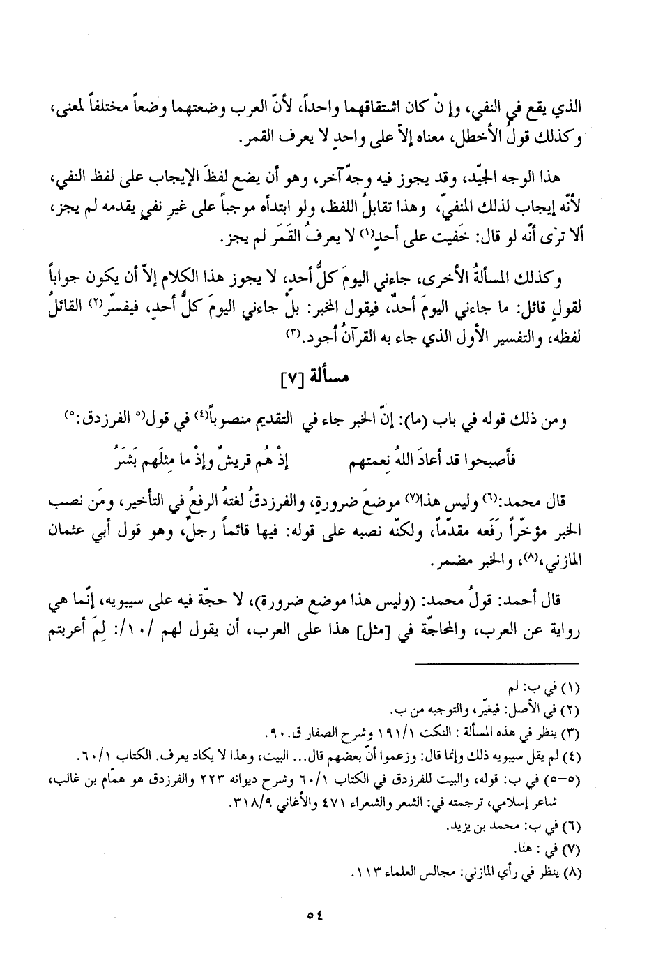 قال أحمد: قول محمد: (وليس هذا موضع ضرورة)، لا حجة فيه على سيبويه، إنما هي رواية عن العرب، والمحاجة في [مثل] هذا على العرب، أن يقول لهم /10/: لم أعربتم