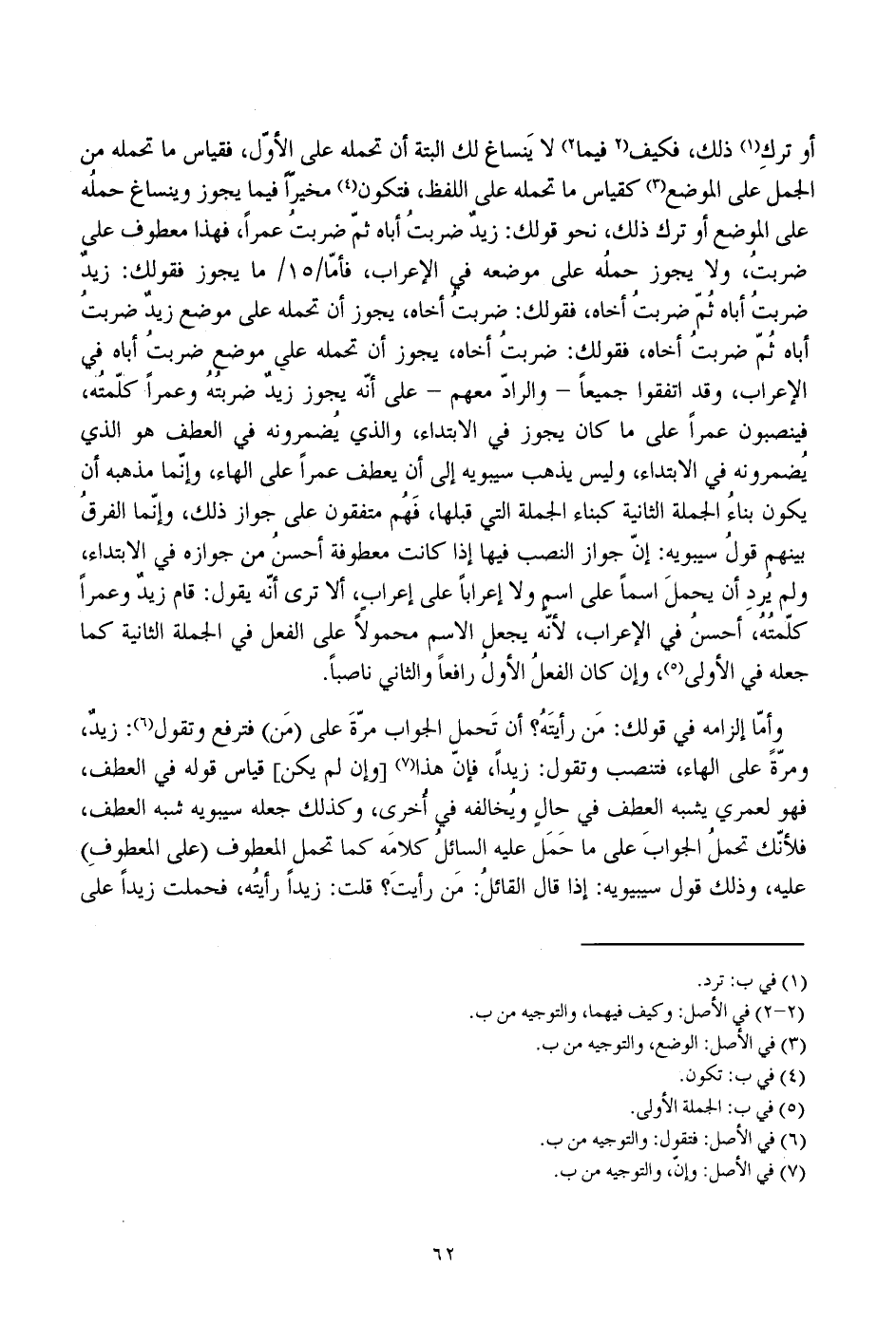 أو ترك ذلك، فكيف فيما لا ينساغ لك البتة أن تحمله على الأول، فقياس ما تحمله من الجمل على الموضع كقياس ما تحمله على اللفظ، فتكون مخيرا فيما يجوز وينساغ حمله على الموضع أو ترك ذلك، نحو قولك: زيد ضربت أباه ثم ضربت عمرا، فهذا معطوف على ضربت، ولا يجوز حمله على موضعه في الإعراب، فأما /15/ ما يجوز فقولك: زيد ضربت أباه ثم ضربت أخاه، فقولك: ضربت أخاه، فيجوز أن تحمله على موضع زيد ضربت أباه ثم ضربت أخاه، فقولك: ضربت يجوز أن تحمله على موضع ضربت أباه في الإعراب، وقد اتفقوا جميعا- والراد معهم- على أنه يجوز زيد ضربته وعمرا كلمته، فينصبون عمرا على ما كان يجوز في الابتداء، والذي يضمرونه في العطف هو الذي يضمرونه في الابتداء، وليس يذهب سيبويه إلى أن يعطف عمرا على الهاء، وإنما مذهبه أن يكون بناء الجملة الثانية كبناء الجملة التي قبلها، فهم منفقون على جواز ذلك، وإنما الفرق بينهم قول سيبويه: إن جواز النصب فيها إذا كانت معطوفة أحسن من جوازه في الابتداء، ولم يرد أن يحمل اسما على اسم ولا إعرابا على إعراب، ألا ترى أنه يقول: قام زيد وعمرا كلمته، أحسن في الإعراب، لأنه يجعل الاسم محمولا على الفعل في الجملة الثانية كما جعله في الأولى، وإن كان الفعل الأول رافعا والثاني ناصبا.