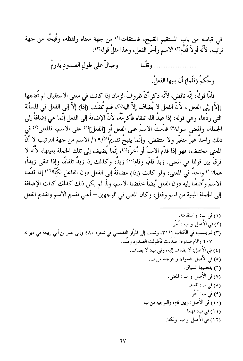 فأما قوله: إنه ناقض، لأنه ذكر أن ظروف الزمان إذا كانت في معنى الاستقبال لم تضفها [إلا] إلى الفعل، لأن الفعل لا يضاف إلا إليه، فلم تضف (إذا) إلا إلى الفعل في المسألة التي ردها، وهي قوله: إذا عبد الله تلقاه فأكرمه، لأن الإضافة إلى الفعل إنما هي إضافة إلى الجملة، والمعنى سواء قدمت الاسم على الفعل أو [الفعل] على الاسم، فالمعنى في ذلك واحد غير متغير ولا منتقض، وإنما يقبح تقديم /19/ الاسم من جهة الترتيب لا أن المعنى مختلف، فهو إذا قدم الاسم أو أخره، إنما يضيف إلى تلك الجملة بعينها، لأنه لا فرق بين قولنا في المعنى: زيد قام، وقام زيد، وكذلك إذا زيد تلقاه، وإذا تلقى زيدا، هما واحد في المعنى، ولو كانت (إذا) مضافة إلى الفعل دون الفاعل لكنا إذا قدمنا الاسم وأضفنا إليه دون الفعل أيضا خفضنا الاسم، ولما لم يكن ذلك كذلك كانت الإضافة إلى الجملة المبنية من اسم وفعل، وكان المعنى في الوجهين- أعني تقديم الاسم وتقديم الفعل
