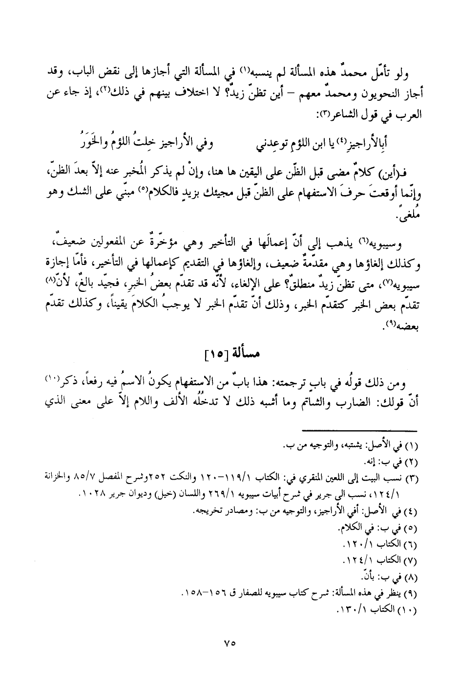 ولو تأمل محمد هذه المسألة لم ينسبه في المسألة التي أجازها إلى نقض الباب، وقد أجاز النحويون ومحمد معهم- أين تظن زيد؟ لا اختلاف بينهم في يذلك، إذا جاء عن العرب في قول الشاعر: