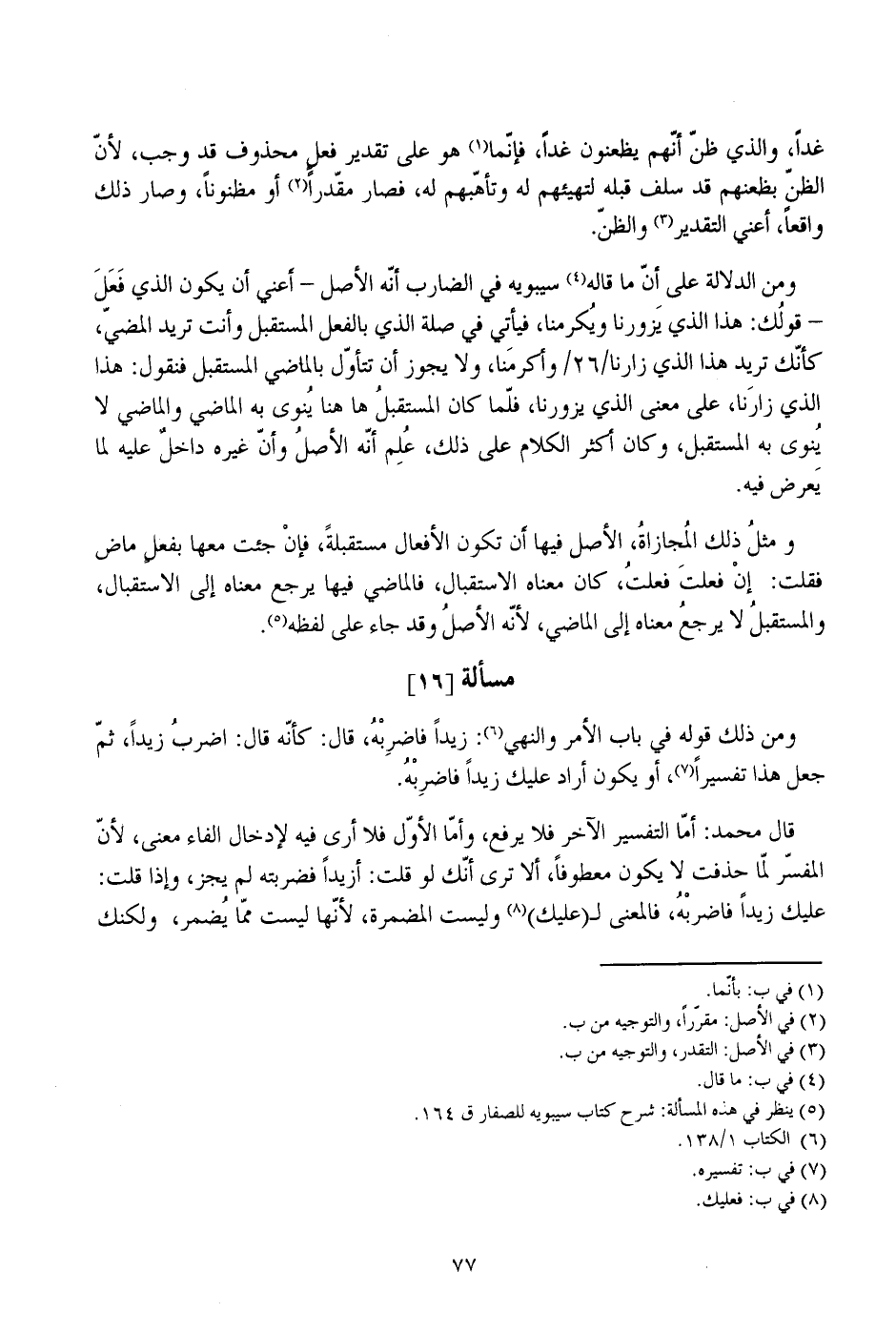 ومن الدلالة على أن ما قاله سيبويه في الضارب أنه الأصل- أعني أن يكون الذي فعل- قولك: هذا الذي يزورنا ويكرمنا، فيأتي في صلة الذي بالفعل المستقبل وأنت تريد المضيء، كأنك تريد هذا الذي زارنا /26/ وأكرمنا، ولا يجوز أن تتأول بالماضي المستقبل فنقول: هذا الذي زارنا، على معنى الذي يزورنا، فلما كان المستقبل ها هنا ينوى به الماضي والماضي لا ينوى به المستقبل، وكان أكثر الكلام على ذلك، علم أنه الأصل وأن غيره داخل عليه لما يعرض فيه.
