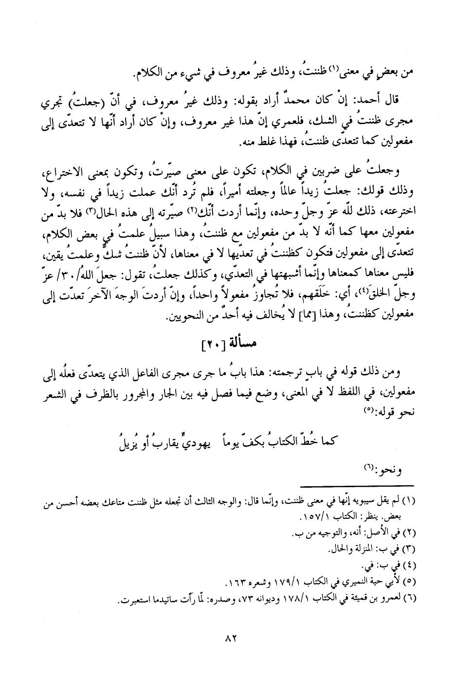 ومن ذلك قوله في باب ترجمته: هذا باب ما جرى مجرى الفاعل الذي يتعدى فعله إلى مفعولين، في اللفظ لا في المعنى، وضع فيما فصل فيه بين الجار والمجرور بالظرف في الشعر نحو قوله: