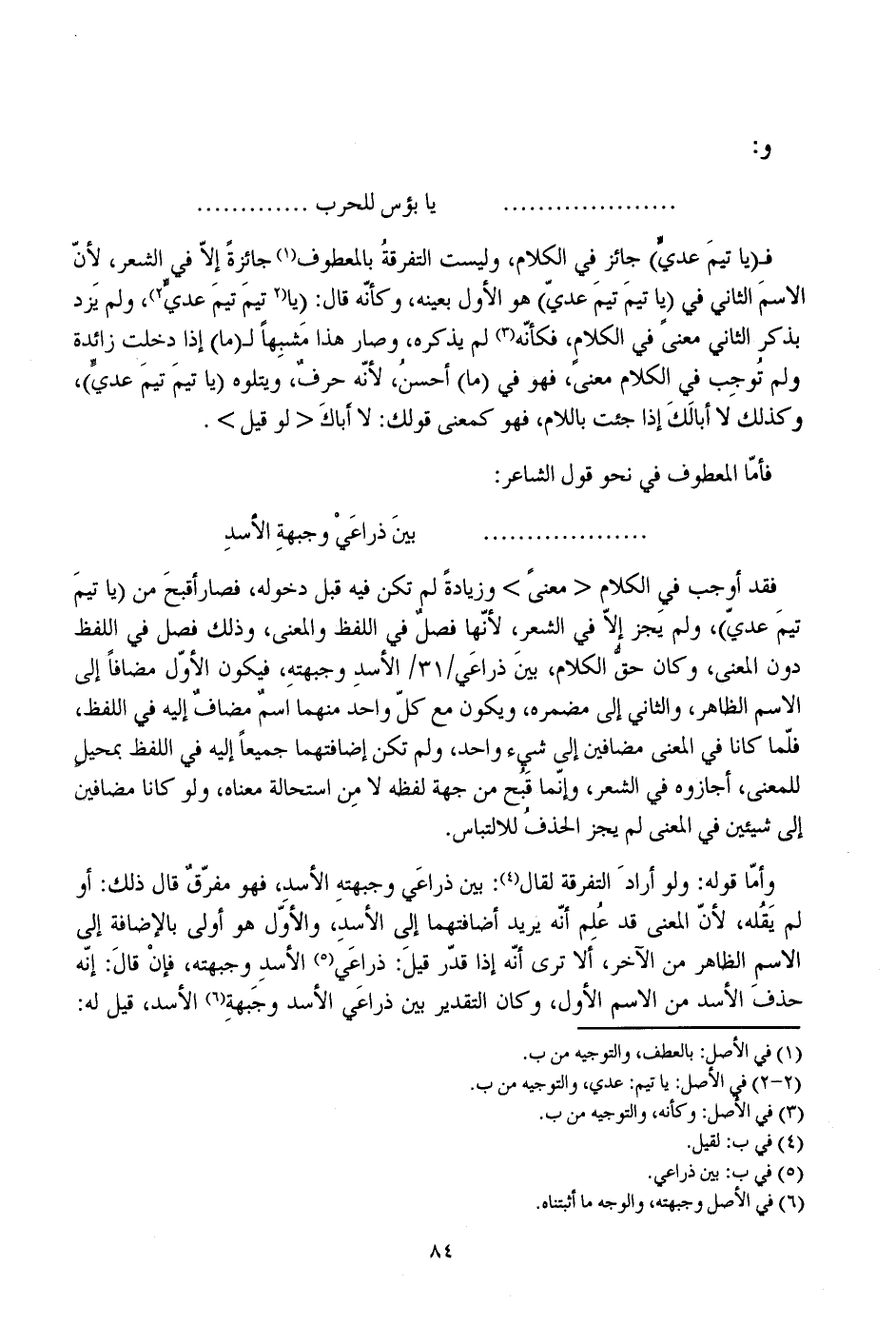 فقد أوجب في الكلام "معنى" وزيادة لم تكن فيه قبل دخولها، فصار أقبح من (يا تيم تيم عدي) ولم يجز إلا في الشعر، لأنها فصل في اللفظ والمعنى، وذلك فصل في اللفظ دون المعنى، وكان حق الكلام، بين ذراعي /31/ الأسد وجبهته، فيكون الأول مضافا إلى الاسم الظاهر، والثاني إلى مضمره، ويكون مع كل واحد منهما اسم مضاف إليه في اللفظ، فلما كانا في المعنى مضافين إلى شيء واحد، ولم تكن إضافتهما جميعا إليه في اللفظ بمحيل للمعنى، أجازوه في الشعر، وإنما قبح من جهة لفظه لا من استحالة معناه، ولو كانا مضافين إلى شيئين في المعنى لم يجز الحذف للالتباس.