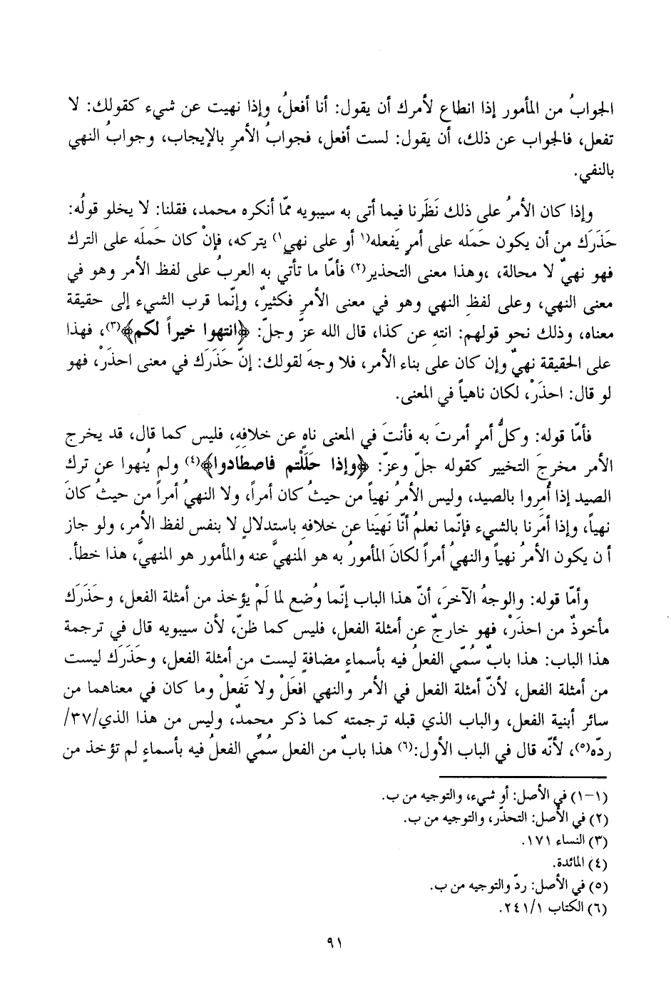 وإذا كان الأمر على ذلك نظرنا فيما أتى به سيبويه مما أنكره محمد، فقلنا: لا يخلو قوله: حذرك من أن يكون حمله على أمر يفعله أو على نهي يتركه، فإن كان حمله على الترك فهو نهي لا محالة، وهذا معنى التحذير فأما ما تأتي به العرب على لفظ الأمر وهو في معنى النهي، وعلى لفظ النهي وهو في معنى الأمر فكثير، وإنما قرب الشيء إلى حقيقة معناه، وذلك نحو قولهم: انته عن كذا، قال الله عز وجل: {انتهوا خيرا لكم}، فهذا على الحقيقة نهي وإن كان على بناء الأمر، فلا وجه لقولك: إن حذرك في معنى احذر، فهو لو قال: احذر، لكان ناهيا في المعنى.