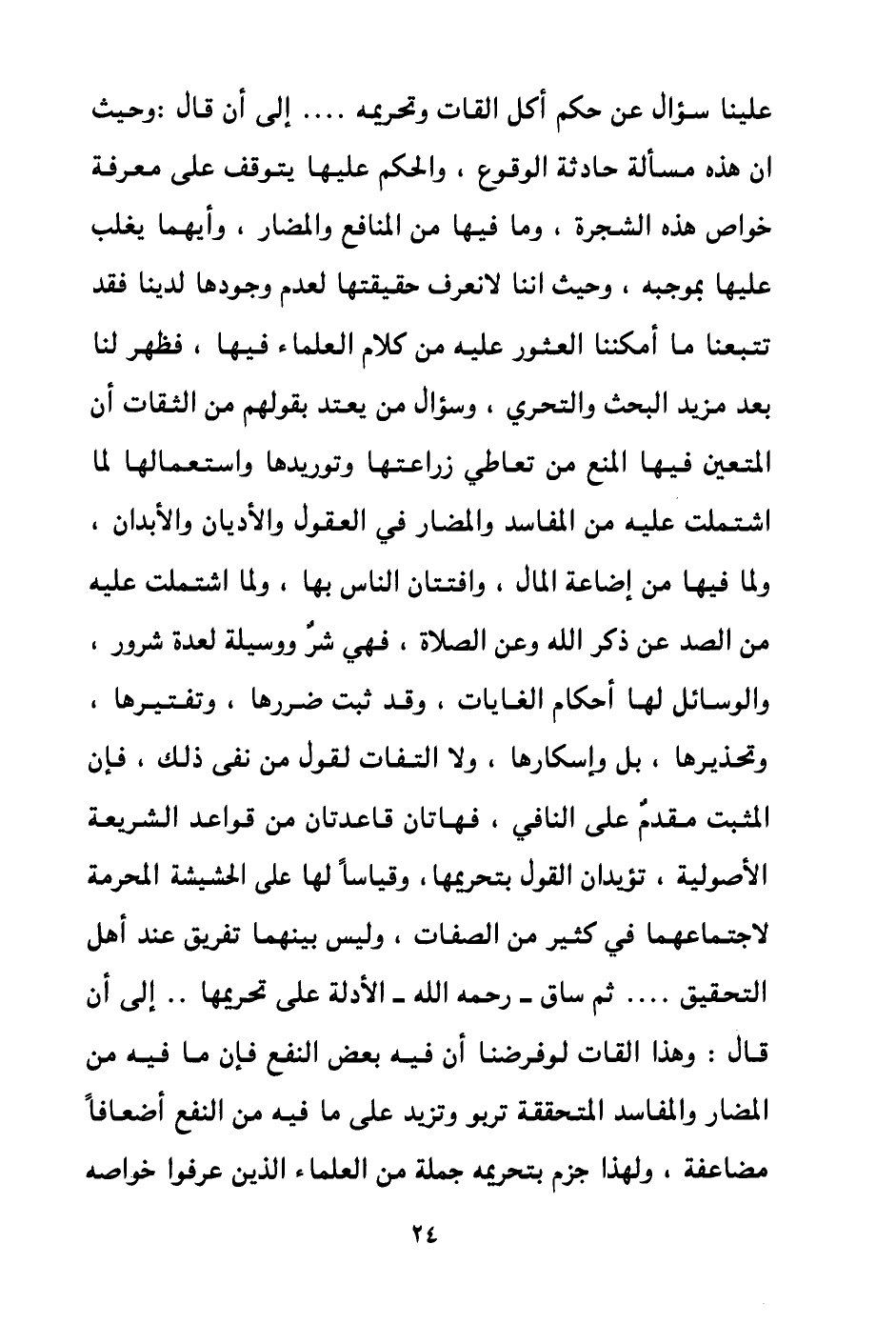 علينا سؤال عن حكم أكل القات وتحريمه.... إلى أن قال: وحيث أن هذه مسألة حادثة الوقوع، والحكم عليها يتوقف على معرفة خواص هذه الشجرة، وما فيها من المنافع والمضار، وأيهما يغلب عليها بموجبه، وحيث أننا لا نعرف حقيقتها لعدم وجودها لدينا فقد تتبعنا ما أمكننا العثور عليه من كلام العلماء فيها فظهر لنا بعد مزيد البحث والتحري، وسؤال من يعتد بقولهم من الثقات أن المتعين فيها المنع من تعاطي زراعتها وتوريدها واستعمالها لما اشتملت عليه من المفاسد والمضار في العقول والأديان والأبدان، ولما فيها من إضاعة المال، وافتتان الناس بها، ولما اشتملت عليه من الصد عن ذكر الله وعن الصلاة، فهي شر ووسيلة لعدة شرور، والوسائل لها أحكام الغايات، وقد ثبت ضررها، وتفتيرها، وتخديرها، بل وإسكارها، ولا التفات لقول من نفى ذلك، فإن المثبت مقدم على النافي، فهاتان قاعدتان من قواعد الشريعة الأصولية، تؤيدان القول بتحريمها، وقياسا لها على الحشيشة المحرمة لاجتماعهما في كثير من الصفات، وليس بينهما تفريق عند أهل التحقيق.... ثم ساق- رحمه الله- الأدلة على تحريمها.. إلى أن قال: وهذا القات لو فرضنا أن فيه بعض النفع فإن ما فيه من المضار والمفاسد المتحققة تربو وتزيد على ما فيه من النفع أضعافا مضاعفة، ولهذا جزم بتحريمه جملة من العلماء الذين عرفوا خواصه