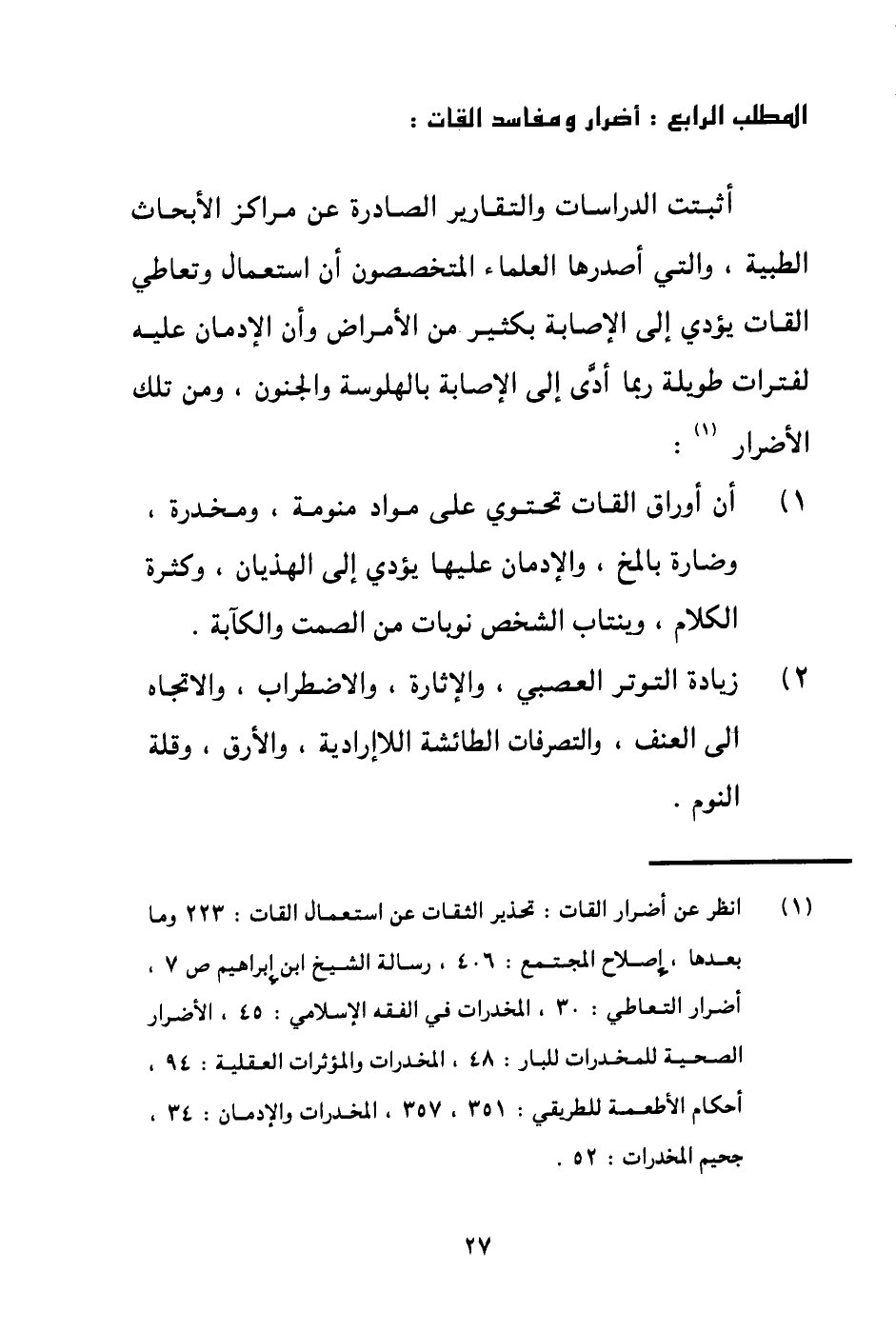 1 انظر عن أضرار القات: تحذير الثقات عن استعمال القات: 223 وما بعدها، إصلاح المجتمع: 406، رسالة الشيخ ابن ابراهيم ص 7، أضرار التعاطي: 30، المخدرات في الفقه الإسلامي: 45، الأضرار الصحية للمخدرات للبار 48، المخدرات والمؤثرات العقلية 94، أحكام الأطعمة للطريقي: 351، 357، المخدرات والإدمان: 34، جحيم المخدرات: 52.