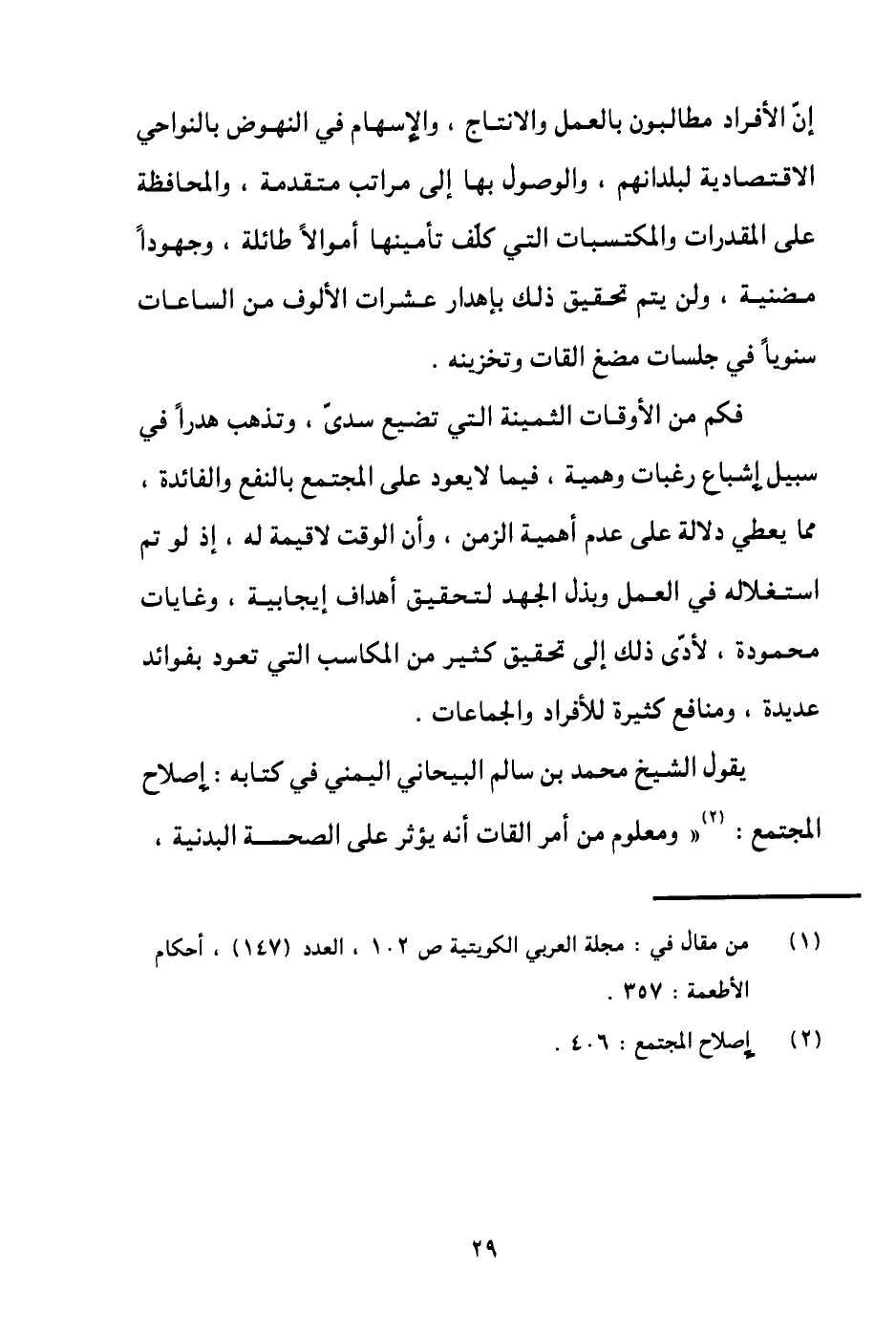 إن الأفراد مطالبون بالعمل والإنتاج، والإسهام في النهوض بالنواحي الاقتصادية لبلدانهم، والوصول بها إلى مراتب، متقدمة، والمحافظة على المقدرات والمكتسبات التي كلف تأمينها أموالا طائلة وجهودا مضنية، ولن يتم تحقيق ذلك بإهدار عشرات الألوف من الساعات سنويا في جلسات مضغ القات وتخزينه.