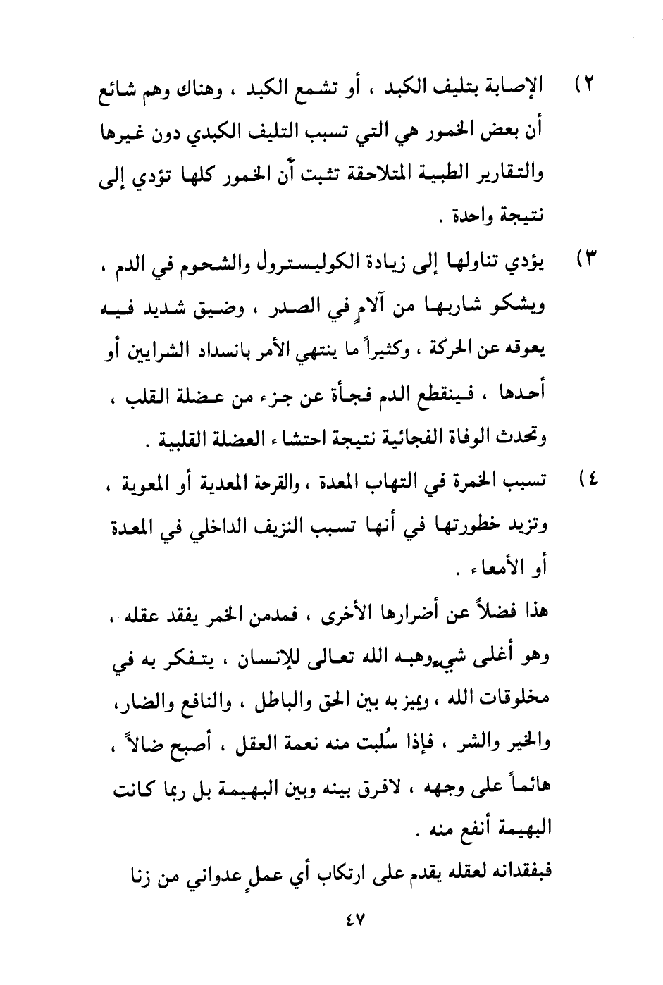 3) يؤدي تناولها إلى زيادة الكوليسترول والشحوم في الدم، ويشكو شاربها من آلام في الصدر، وضيق شديد فيه يعوقه عن الحركة، وكثيرا ما ينتهي، الأمر بانسداد الشرايين أو أحدها، فينقطع الدم فجأة عن جزء من عضلة القلب وتحدث الوفاة الفجائية نتيجة احتشاء العضلة القلبية.