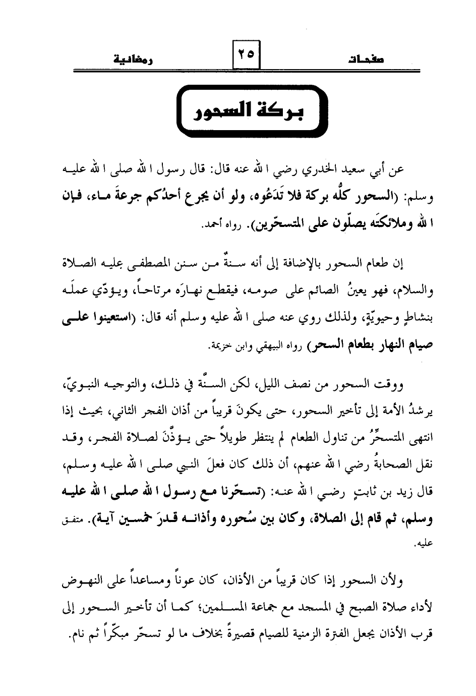 عن أبي سعيد الخدري رضي الله عنه قال: قال رسول الله صلى الله عليه وسلم: "السحور كله بركة فلا تدعوه، ولو أن يجرع أحدكم جرعة ماء، فإن الله وملائكته يصلون على المتسحرين" رواه أحمد.