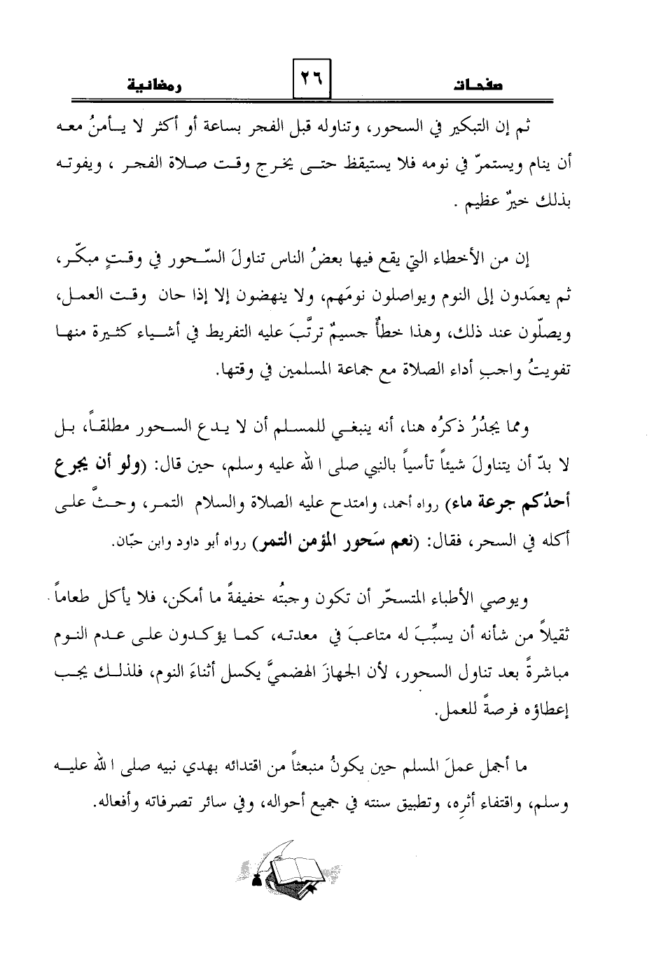 إن من الأخطاء التي يقع فيها بعض الناس تناول السحور في وقت مبكر، تم يعمدون إلى النوم ويواصلون نومهم، ولا ينهضون إلا إذا حان وقت العمل، ويصلون عند ذلك، وهذا خطأ جسيم ترتب عليه التفريط في أشياء كثيرة منها تفويت واجب أداء الصلاة مع جماعة المسلمين في وقتها.