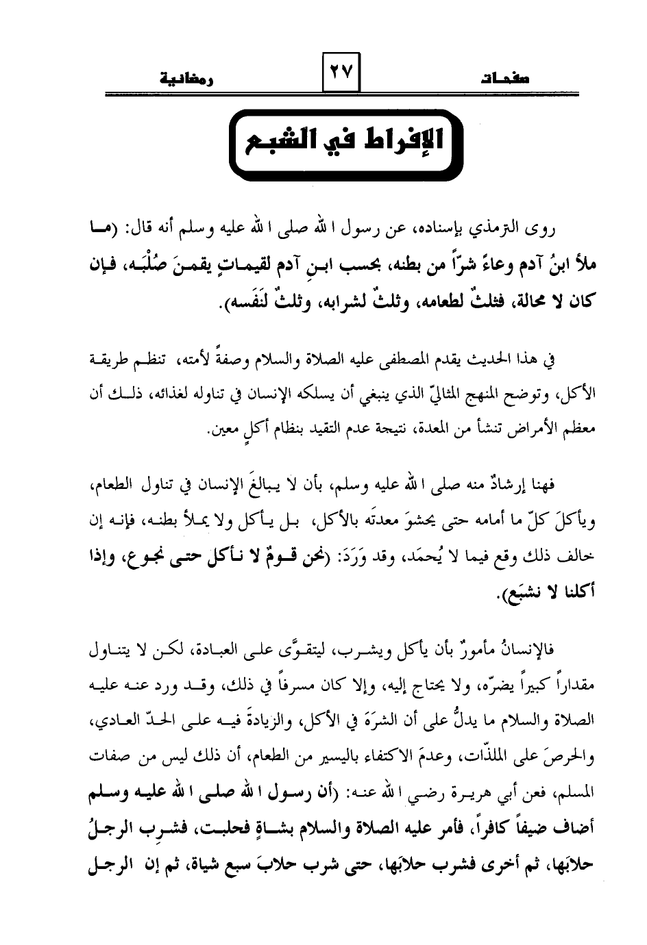 روى الترمذي بإسناده، عن رسول الله صلى الله عليه وسلم أنه قال: "ما ملأ ابن آدم وعاء شرا من بطنه، بحسب ابن آدم، لقيمات يقمن صلبه، فإن كان لا محالة، فثلث لطعامه، وثلث لشرابه، وثلث لنفسه".