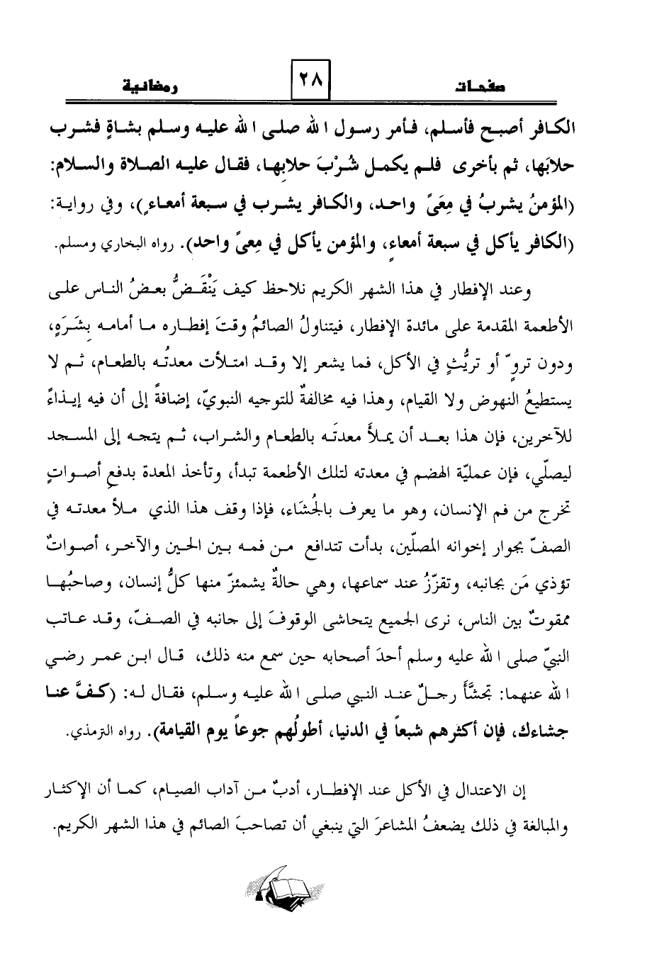 الكافر أصبح فأسلم، فأمر رسول الله صلى الله عليه وسلم بشاه فشرب حلابها، ثم بأخرى فلم يكمل شرب حلابها، فقال عليه الصلاة والسلام: "المؤمن يشرب في معي واحد، والكافر يشرب في سبعة أمعاء"، وفي رواية: "الكافر يأكل في سبعة أمعاء، والمؤمن يأكل في معي واحد". رواه البخاري ومسلم. وعند الافطار في هذا الشهر الكريم نلاحظ كيف تنقض بعض الناس على الأطعمة المقدمة على مائدة الإفطار، فيتناول الصائم وقت إفطاره ما أمامه بشرهٍ، ودون تروٍّ أو تريث في الأكل، فما يشعر إلا وقد امتلأت معدته بالطعام، ثم لا يستطيع النهوض ولا القيام، وهذا فيه مخالفة للتوجيه النبوي، إضافة إلى أن فيه إيذاء للآخرين، فإن هذا بعد أن يملأ معدته بالطعام والشراب، ثم يتجه إلى المسجد ليصلي، فإن عملية الهضم في معدته لتلك الأطعمة تبدأ، وتأخذ المعدة بدفع أصوات تخرج من فم الإنسان، وهو ما يعرف بالحشاء، فإذا وقف هذا الذي ملأ معدته في الصف بجوار إخوانه المصلين، بدأت تتدافع من فمه بين الحين والآخر، أصوات تؤذي من بجانبه، وتقزز عند سماعها، وهي حالة يشمئز منها كل إنسان، وصاحبها ممقوت بين الناس، نرى الجميع يتحاشى الوقوف إلى جانبه في الصف، وقد عاتب النبي صلى الله عليه وسلم أحد أصحابه حين سمع منه ذلك، قال ابن عمر رضي الله عنهما: تجشَّأ رجل عند النبي صلى الله عليه وسلم، فقال له: "كف عنا جشاءك، كان أكثرهم شبعا في الدنيا، أطولهم جوعا يوم القيامة". رواه الترمذي.