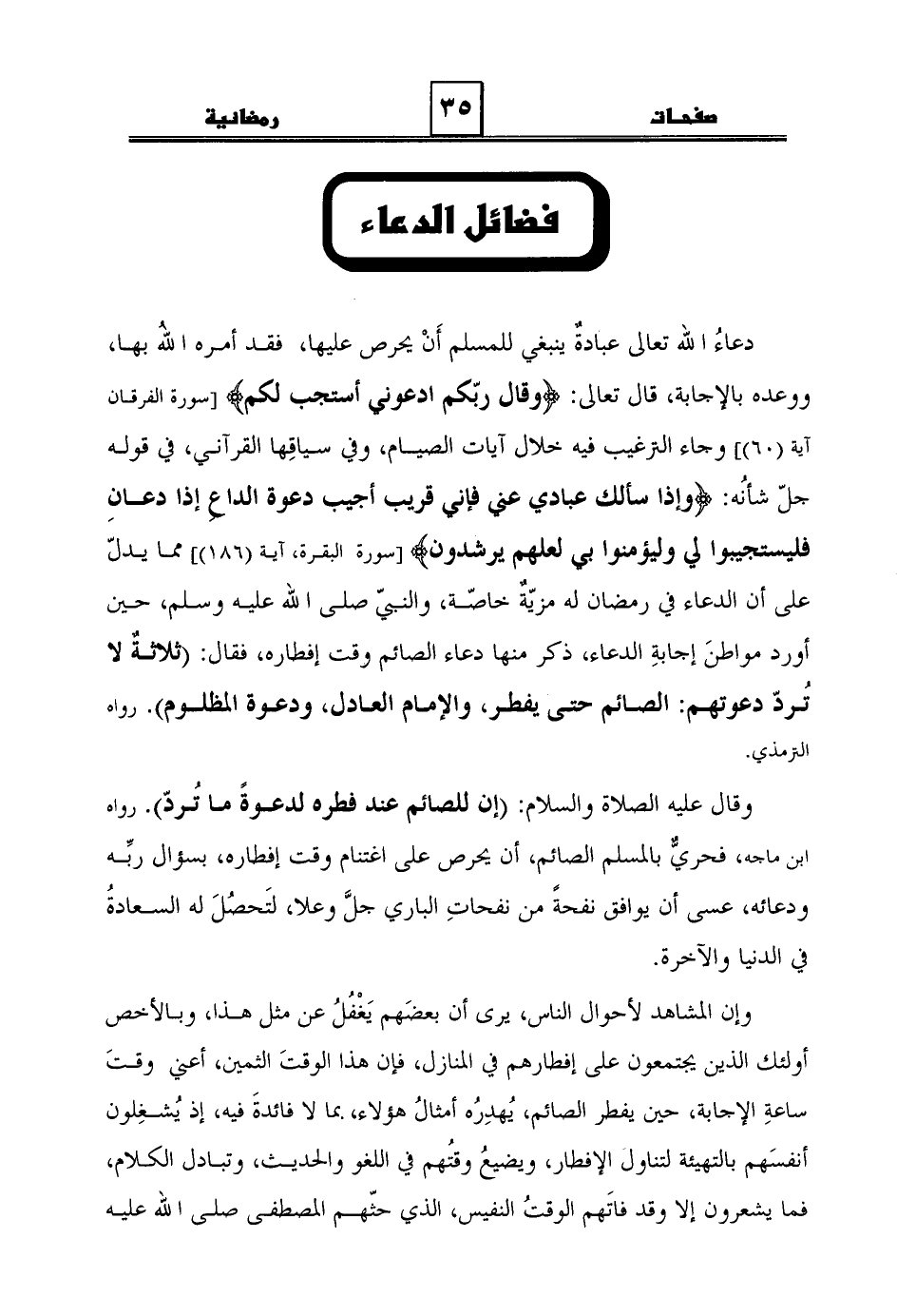 دعاء الله تعالى عبادة ينبغي للمسلم أن يحرص عليها، فقد أمره الله بها، ووعده بالإجابة، قال تعالى: {وَقَالَ رَبُّكُمُ ادْعُونِي أَسْتَجِبْ لَكُمْ} [سورة الفرقان آية (60) ] وجاء الترغيب فيه خلال آيات الصيام، وفي سياقها القرآني، في قوله جلَّ شأنه،: {وَإِذَا سَأَلَكَ عِبَادِي عَنِّي فَإِنِّي قَرِيبٌ أُجِيبُ دَعْوَةَ الدَّاعِ إِذَا دَعَانِ فَلْيَسْتَجِيبُوا لِي وَلْيُؤْمِنُوا بِي لَعَلَّهُمْ يَرْشُدُونَ} [سورة البقرة، آية (186) ] ، مما يدل على أن الدعاء في رمضان له مزيّة خاصة، والنبي صلى الله عليه وسلم، حين أورد مواطن إجابة الدعاء، ذكر منها دعاء الصائم وقت إفطاره، فقال: "ثلاثة لا ترد دعوتهم: الصائم حتى يفطر، والإمام العادل، ودعوة المظلوم". رواه الترمذي.