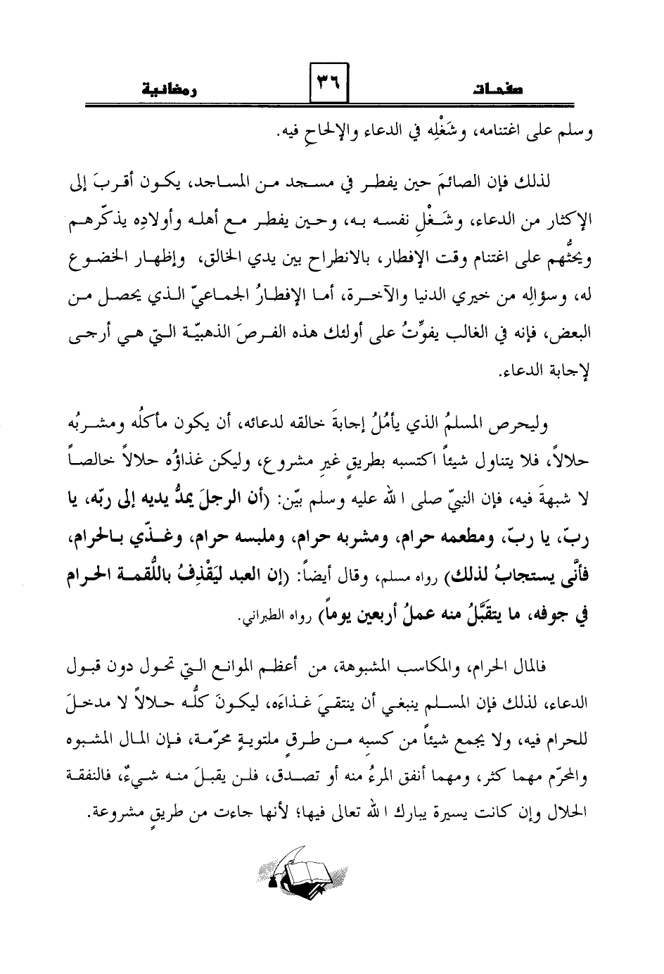 وليحرص المسلم الذي يأمل إجابة خالقه لدعائه، أن يكون مأكله ومشربه حلالا، فلا يتناول شيئا اكتسبه بطريق غير مشروع، وليكن غذاؤه حلالا خالصا لا شبهة فيه، فإن النبي صلى الله عليه وسلم بيّن: "أن الرجل يمد يده إلى ربه، يا رب، يا رب، ومطعمه حرام، ومشربه حرام، وملبسه حرام، وغذي بالحرام، فأنَّى يستجاب لذلك" رواه مسلم، وقال أيضا: "إن العبد ليقذف باللقمة الحرام في جوفه، ما يتقبَل منه عمل أربعين يوما" رواه الطبراني.