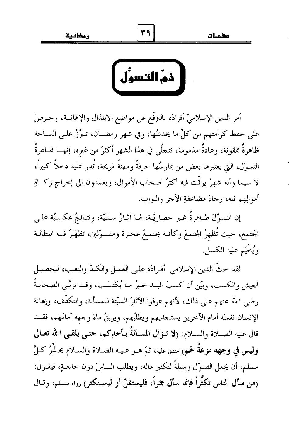 أمر الدين الإسلامي أفراده بالترفع عن مواضع الابتذال والإهانة، وحرص على حفظ كرامتهم من كل ما يخدشها، وفي شهر رمضان، تبرز على الساحة ظاهرة ممقوتة، وعادة مذمومة تتجلى في هذا الشهر أكثر من غيره، إنها ظاهرة التسول التي يعتبرها بعض من يمارسها حرفة ومهنة مربحة، تدر عليه دخلا كبيرا، لا سيما وأنه شهر يوقّت فيه أكثر أصحاب الأموال، ويعقدون إلى إخراج زكاة أموالهم فيه، رجاء مضاعفة الأجر والثواب.