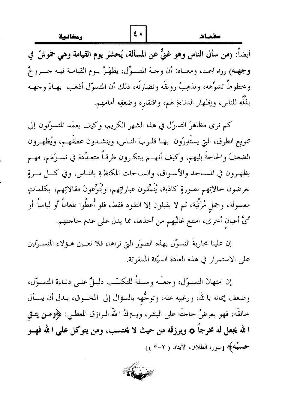 أيضا: "من سأل الناس وهو غنٌّي عن المسألة، يحشر يوم القيامة وهي خموش في وجهه" رواه أحمد، ومعناه: أن وجة المتسوِّل، يظهر يوم القيامة فيه جروح وخطوط تشوِّهه، وتذهب رونقه ونضارته، ذلك أن المتسوَّل أذهب بهاء وجهه بذلِّه للناس، وإظهار الدناءة لهم، وافتقاره وضعفه أمامهم.