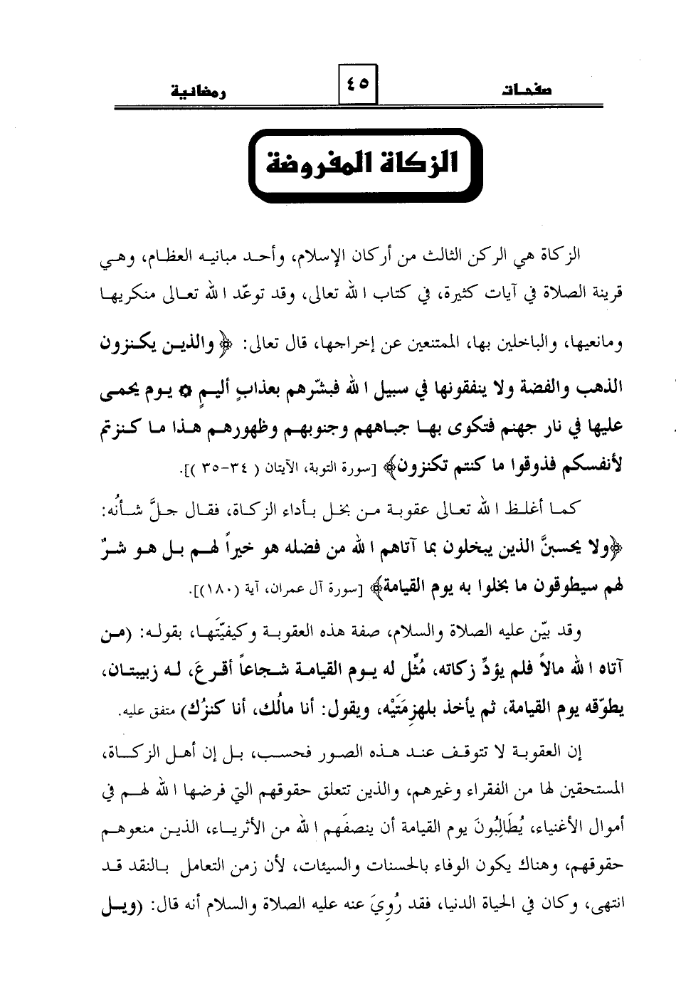 الزكاة هي الركن الثالث من أركان الإسلام، وأحد مبانيه العظام، وهي قرينة الصلاة في آيات كثيرة، في كتاب الله تعالى وقد توعَّد الله تعالى منكريها ومانعيها، والباخلين بها، الممتنعين عن إخراجها، قال تعالى: {وَالَّذِينَ يَكْنِزُونَ الذَّهَبَ وَالْفِضَّةَ وَلا يُنْفِقُونَهَا فِي سَبِيلِ اللَّهِ فَبَشِّرْهُمْ بِعَذَابٍ أَلِيمٍ يَوْمَ يُحْمَى عَلَيْهَا فِي نَارِ جَهَنَّمَ فَتُكْوَى بِهَا جِبَاهُهُمْ وَجُنُوبُهُمْ وَظُهُورُهُمْ هَذَا مَا كَنَزْتُمْ لأَنْفُسِكُمْ فَذُوقُوا مَا كُنْتُمْ تَكْنِزُونَ} [سورة التوبة، الآيتان (34- 35) ] .