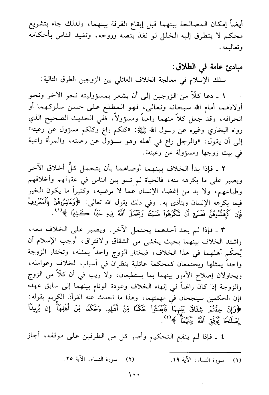 3 - فإذا لم يعد أحدهما يحتمل الآخر. ويصبر على الخلاف معه، واشتد الخلاف بينهما بحيث يخشى من الشقاق والافتراق، أوجب الاسلام أن يُحكّم أهلهما في هذا الخلاف، فيختار الزوج واحداً يمثله، وتختار الزوجة واحداً يمثلها ويجتمعان كمحكمة عائلية ينظران في أسباب الخلاف وعوامله، ويحاولان إصلاح الأمور بينهما بما يستطيعان، ولا ريب في أن كلاً من الزوج والزوجة إذا كان راغباً في انهاء الخلاف وعودة الوئام بينهما الى سابق عهده فان الحكمين سينجحان في مهمتهما، وهذا ما تحدث عنه القرآن الكريم بقوله: {وان خفتم شقاق بينهما فابعثوا حكماً من أهله وحكماً من أهلها، إن يريدا إصلاحاً يوفق الله بينهما} [النساء: 25].