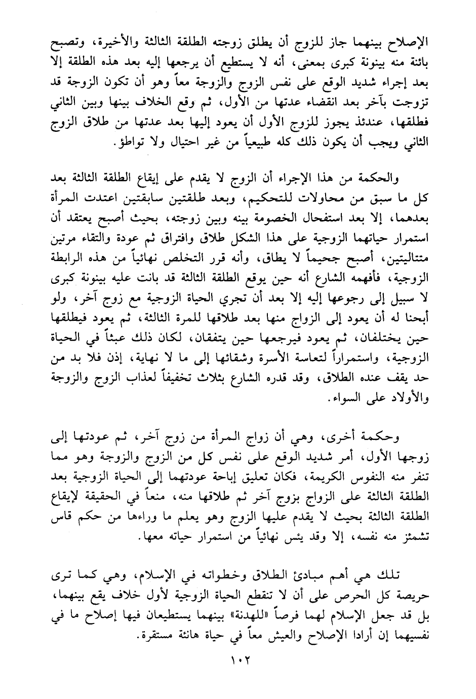 وحكمة أخرى، وهي أن زواج المرأة من زوج آخر، ثم عودتها الى زوجها الأول، أمر شديد الوقع على نفس كل من الزوج والزوجة وهو مما تنفر منه النفوس الكريمة، فكان تعليق إباحة عودتهما الى الحياة الزوجية بعد الطلقة الثالثة على الزواج بزوج آخر ثم طلاقها منه، منعاً في الحقيقة لايقاع الطلقة الثالثة بحيث لا يقدم عليها الزوج وهو يعلم ما وراءها من حكم قاس تشمئز منه نفسه، إلا وقد يئس نهائياً من استمرار حياته معها.