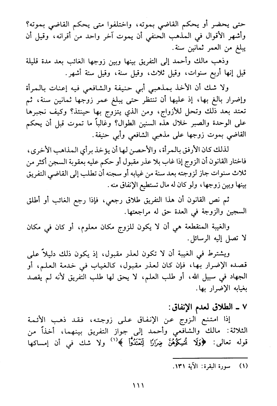 لذلك كان الأرفق بالمرأة، والأحصن لها أن يؤخذ برأي المذاهب الأخرى، فاختار القانون أن الزوج إذا غاب بلا عذر مقبول أو حكم عليه بعقوبة السجن أكثر من ثلاث سنوات جاز لزوجته بعد سنة من غيابه أو سجنه أن تطلب الى القاضي التفريق بينها وبين زوجها، ولو كان له مال تستطيع الانفاق منه.