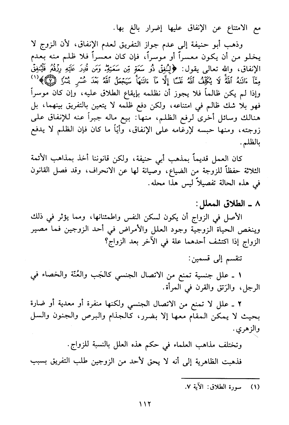 كان العمل قديماً بمذهب أبي حنيفة، ولكن قانوننا أخذ بمذاهب الأئمة الثلاثة حفظاً للزوجة من الضياع، وصيانة لها عن الانحراف، وقد فصل القانون في هذه الحالة تفصيلاً ليس هذا محله.