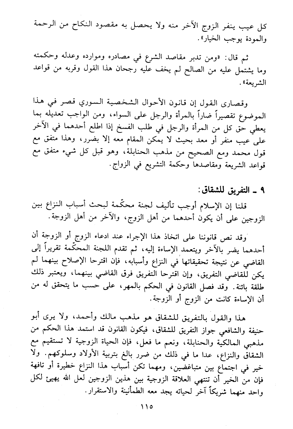 هذا والقول بالتفريق للشقاق هو مذهب مالك وأحمد، ولا يرى أبو حنيفة والشافعي جواز التفريق للشقاق، فيكون القانون قد استمد هذا الحكم من مذهبي المالكية والحنابلة، ونعم ما فعل، فان الحياة الزوجية لا تستقيم مع الشقاق والنزاع، عدا ما في ذلك من ضرر بالغ بتربية الأولاد وسلوكهم. ولا خير في اجتماع بين متباغضين، ومهما يكن أسباب هذا النزاع خطيراً أو تافهاً فإن من الخير أن تنتهي العلاقة الزوجية بين هذين الزوجين لعل الله يهيئ لكل واحد منهما شريكا آخر لحياته يجد معه الطمأنينة والاستقرار.