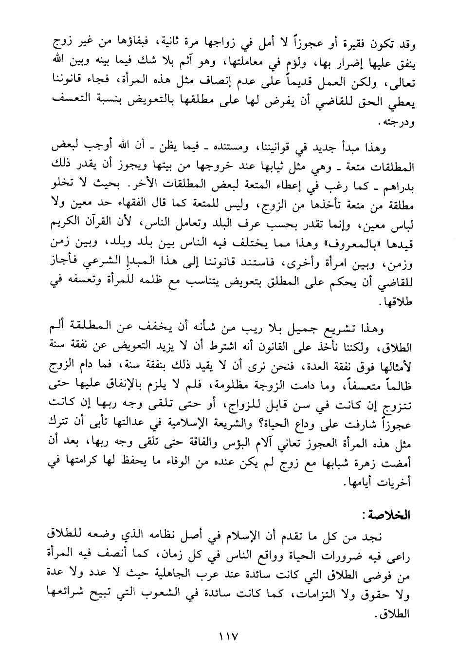 وهذا تشريع جميل بلا ريب من شأنه أنه يخفف عن المطلقة ألم الطلاق، ولكننا نأخذ على القانون أنه اشترط أن لا يزيد التعويض عن نفقة سنة لأمثالها فوق نفقة العدة، فنحن نرى أن لا يقيد ذلك بنفقة سنة، فما دام الزوج ظالماً متعسفاً، وما دامت الزوجة مظلومة، فلم لا يلزم بالانفاق عليها حتى تتزوج ان كانت في سن قابل للزواج، أو حتى تلقى وجه ربها إن كانت عجوزاً شارفت على وداع الحياة؟ والشريعة الاسلامية في عدالتها تأبى أن تترك مثل هذه المرأة العجوز تعاني آلام البؤس والفاقة حتى تلقى وجه ربها، بعد أن أمضت زهرة شبابها مع زوج لم يكن عنده من الوفاء ما يحفظ لها كرامتها في أخريات أيامها.