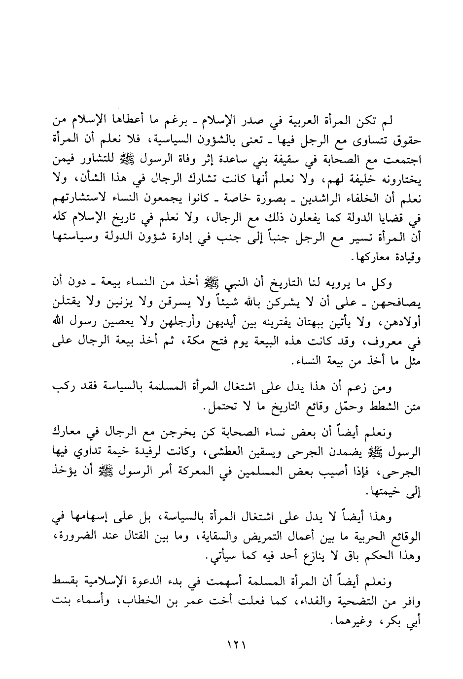لم تكن المرأة العربية في صدر الإسلام - برغم ما أعطاها الاسلام من حقوق تتساوى مع الرجل فيها - تعنى بالشؤون السياسية، فلا نعلم أن المرأة اجتمعت مع الصحابة في سقيفة بني ساعدة إثر وفاة الرسول صلى الله عليه وسلم للتشاور فيمن يختارونه خليفة لهم، ولا نعلم أنها كانت تشارك الرجال في هذا الشأن، ولا نعلم أن الخلفاء الراشدين - بصورة خاصة - كانوا يجمعون النساء لاستشارتهم في قضايا الدولة كما يفعلون ذلك مع الرجال، ولا نعلم في تاريخ الاسلام كله أن المرأة تسير مع الرجل جنباً إلى جنب في إدارة شؤون الدولة وسياستها وقيادة معاركها.
