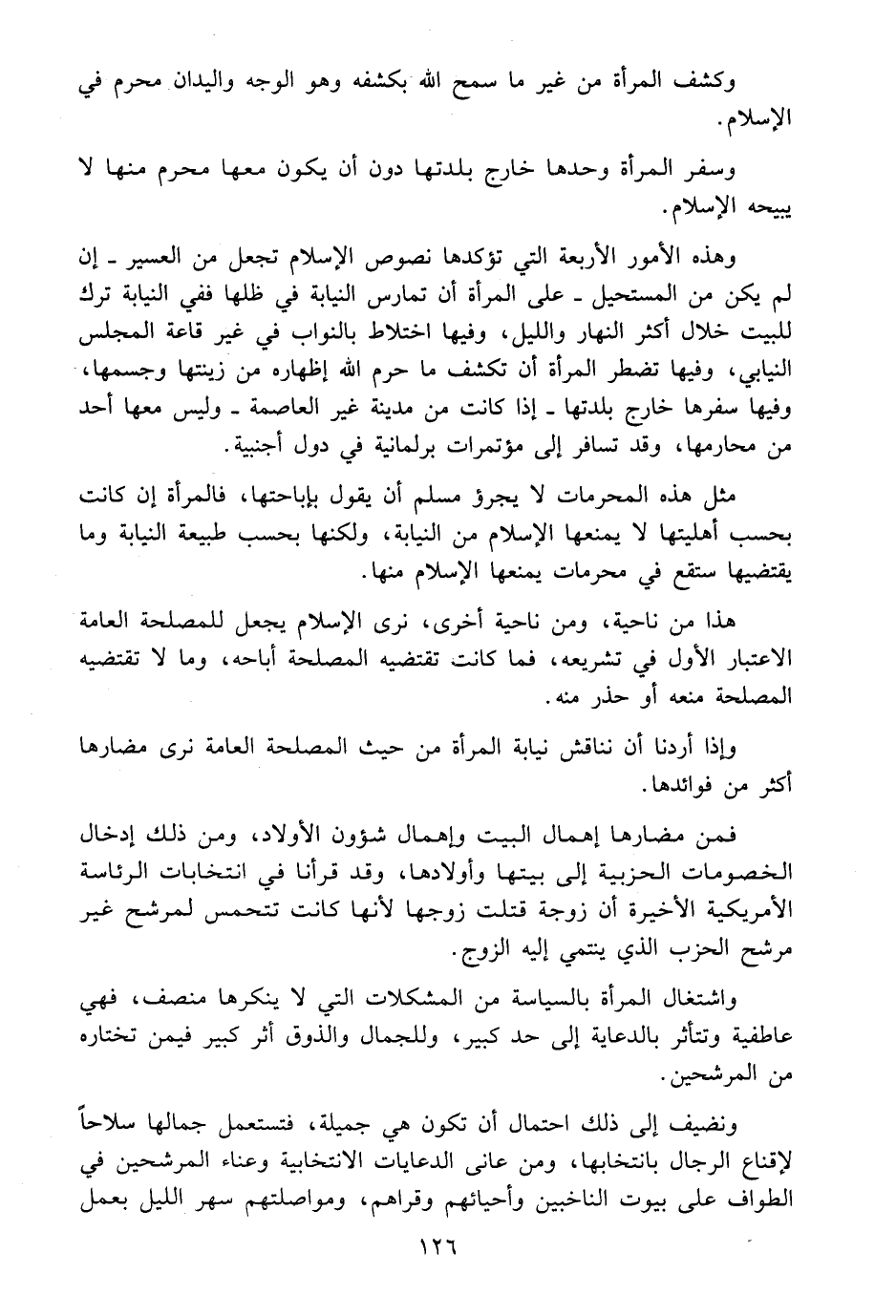 وهذه الأمور الأربعة التي تؤكدها نصوص الاسلام تجعل من العسير - إن لم يكن من المستحيل - على المرأة أن تمارس النيابة في ظلها ففي النيابة ترك للبيت خلال أكثر النهار والليل، وفيها اختلاط بالنواب في غير قاعة المجلس النيابي، وفيها تضطر المرأة أن تكشف ما حرم الله اظهاره من زينتها وجسمها، وفيها سفرها خارج بلدتها - اذا كانت من مدينة غير العاصمة - وليس معها أحد من محارمها، وقد تسافر الى مؤتمرات برلمانية في دول أجنبية.