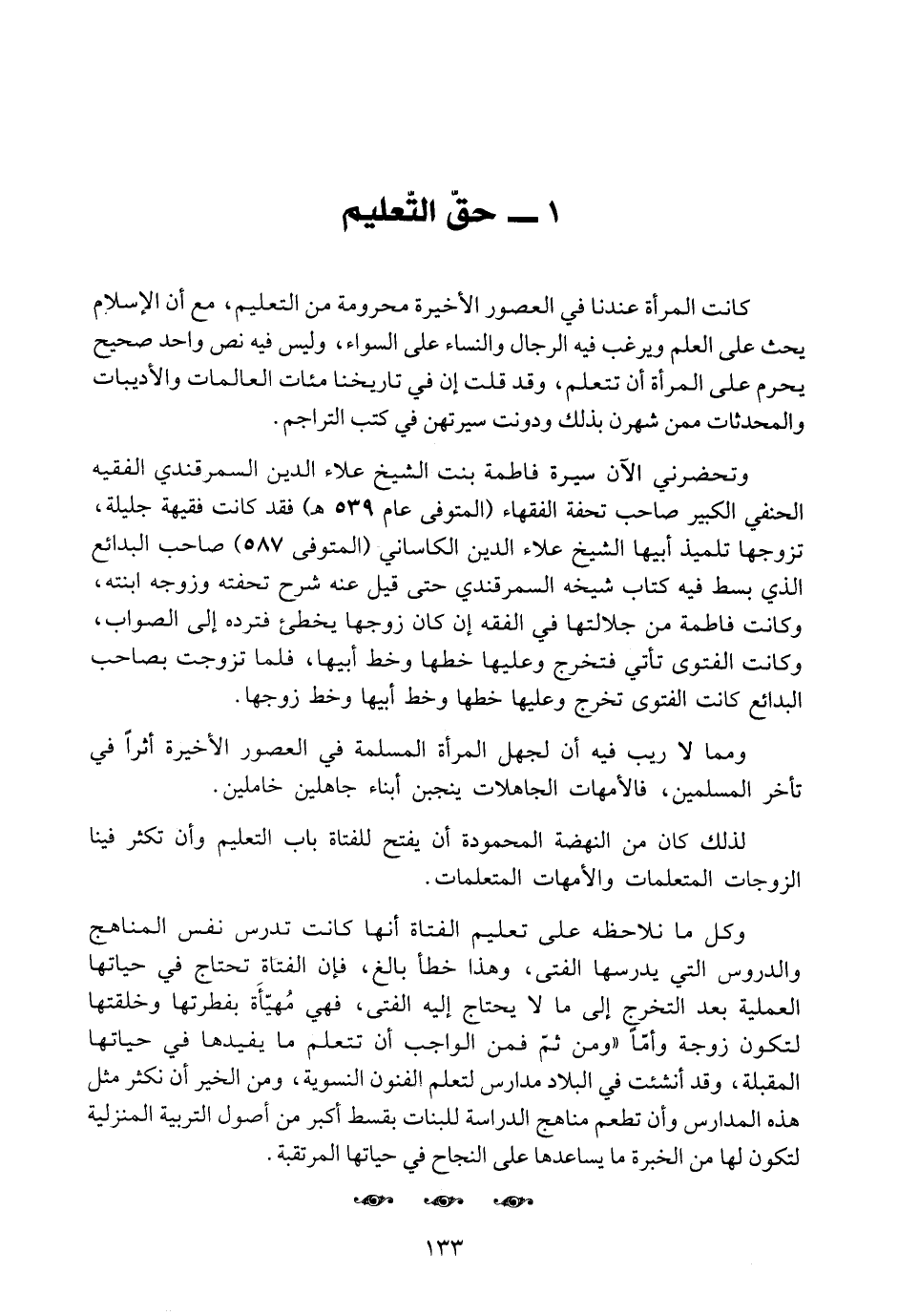 لذلك كان من النهضة المحمودة أن يفتح للفتاة باب التعليم وأن تكثر فينا الزوجات المتعلمات والأمهات المتعلمات.