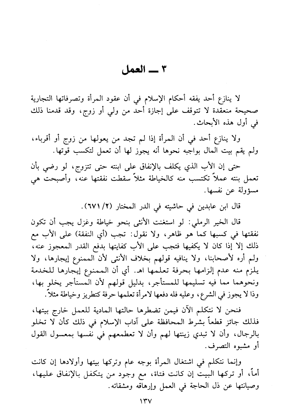وإنما نتكلم في اشتغال المرأة بوجه عام وتركها بيتها وأولادها إن كانت أماً، أو تركها البيت ان كانت فتاة، مع وجود من يتكفل بالانفاق عليها، وصيانتها عن ذل الحاجة في العمل وإرهاقه ومشقاته.