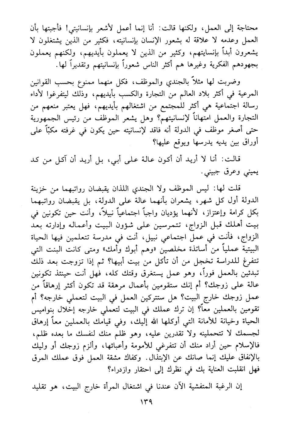 قلت لها: ليس الموظف ولا الجندي اللذان يقبضان رواتبهما من خزينة الدولة أول كل شهر، يشعران بأنهما عالة على الدولة، بل يقبضان رواتبهما بكل كرامة وإعتزاز، لأنهما يؤديان واجباً اجتماعياً نبيلاً، وأنت حين تكونين في بيت أهلك قبل الزواج، تتمرسين على شؤون البيت وأعماله وإدارته بعد الزواج، فأنت في عمل اجتماعي نبيل، أنت في مدرسة تتعلمين فيها الحياة البيتية عملياً من اساتذة مخلصين "وهم أبوك وأمك" ومتى كانت البنت التي تتفرغ للدراسة تخجل من أن تأكل من بيت أبيها؟ ثم اذا تزوجت بعد ذلك تبدأين بالعمل فوراً، وهو عمل يستغرق وقتك كله، فهل أنت حينئذ تكونين عالة على زوجك؟ أم إنك ستقومين بأعمال مرهقة قد تكون أكثر ارهاقاً من عمل زوجك خارج البيت؟ هل ستتركين العمل في البيت لتعملي خارجه؟ أم تقومين بالعملين معاً؟ ان التي أوكلها الله اليك، وفي قيامك بالعملين معاً ارهاق لجسمك لا تتحملينه ولا تقدرين عليه، وهو ظلم منك لنفسك ما بعده ظلم، فالاسلام حين أراد منك أن تتفرغي للأمومة وأعبائها، وألزم زوجك أو وليك بالانفاق عليك إنما صانك عن الابتذال. وكفاك مشقة العمل فوق عملك المرهق فهل انقلبت العناية بك في نظرك الى احتقار وازدراء؟